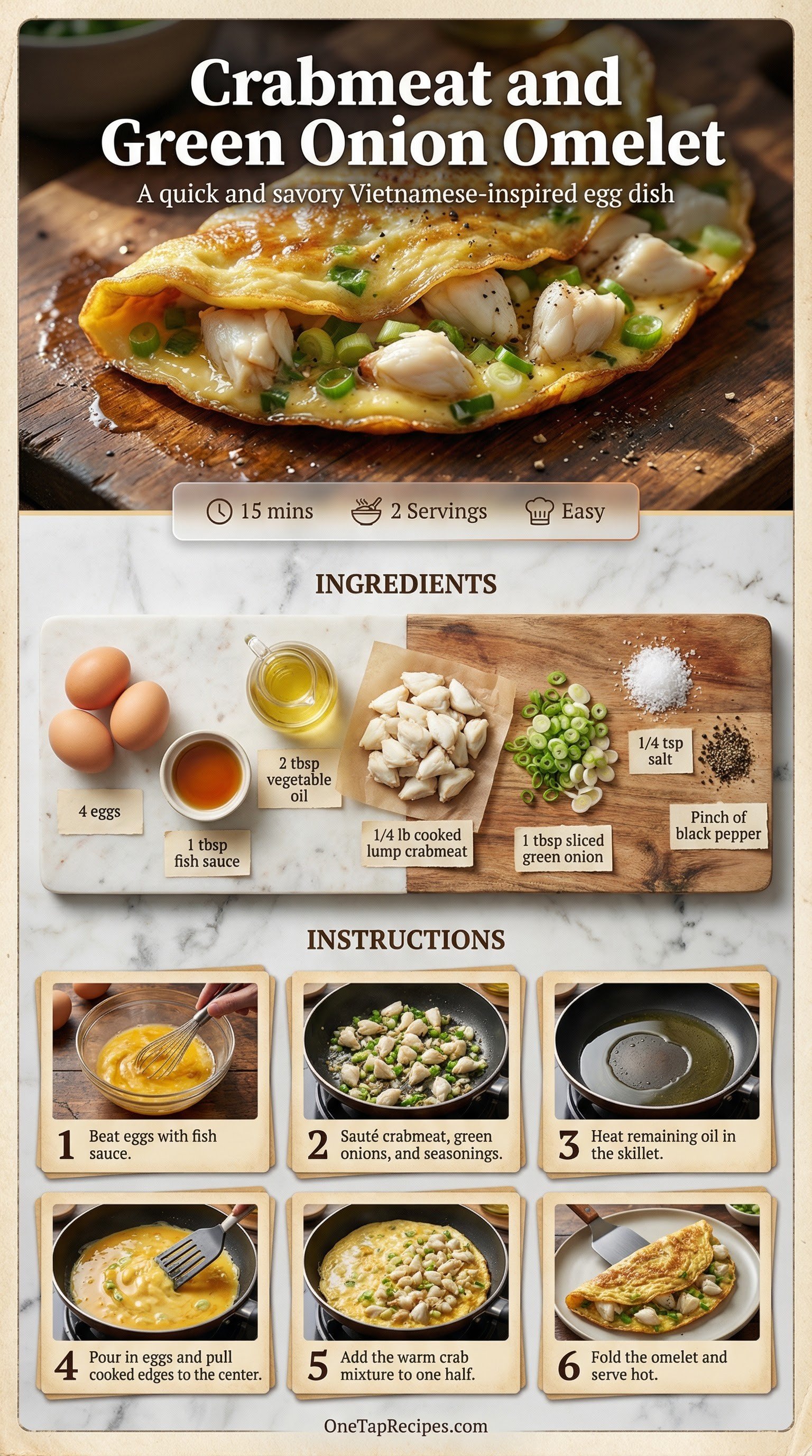 Sweet lump crabmeat meets fresh green onions in this savory, protein-packed breakfast. A splash of fish sauce whisked directly into the eggs adds a deep umami note that complements the seafood perfectly. You'll gently warm the filling first, ensuring the aromatics release their flavor before folding them into the soft, golden eggs. Whether you're serving it with a warm baguette for brunch or pairing it with steamed rice for a light dinner, it's a versatile meal that doesn't disappoint.