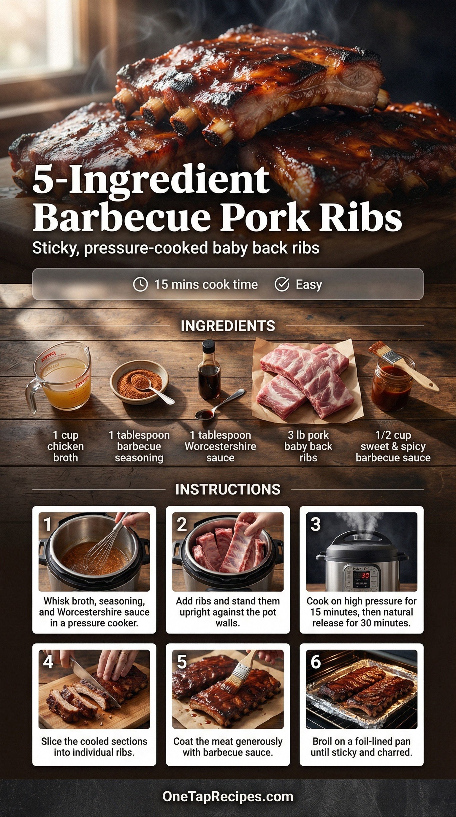 These tender baby back ribs are cooked in a pressure cooker and finished under the broiler for a fast approach to classic barbecue. Using just five ingredients, the recipe relies on a savory broth mixture to infuse the meat with flavor before a final coating of sweet and spicy sauce. The quick broil at the end creates sticky, caramelized edges that mimic hours on a grill. Serve this easy main course for a casual weekend cookout or a surprisingly simple weeknight dinner.