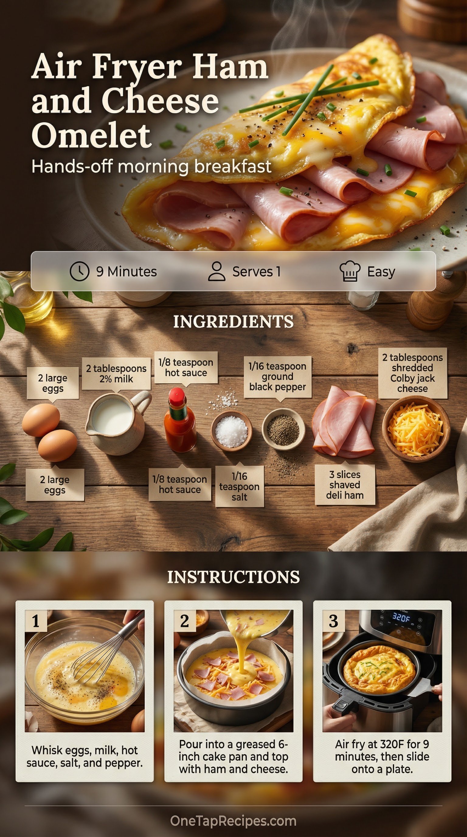 The secret to skipping the stovetop flip is baking your eggs directly in the air fryer. Whisking them with a splash of milk and a dash of hot sauce creates a fluffy, flavorful base that puffs up beautifully in a small cake pan. Melted Colby jack cheese and savory shaved deli ham make this a comforting morning staple. You'll get a hot, satisfying breakfast without standing over a skillet, leaving you free to pour your coffee while it cooks.