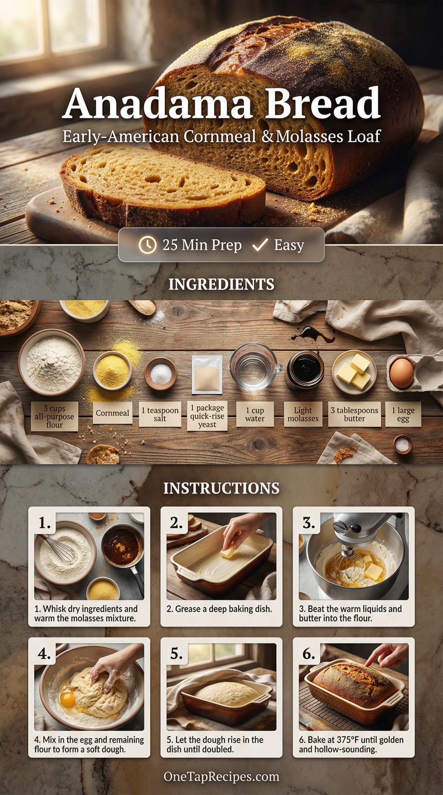 Anadama bread is a classic early-American loaf made with a rich blend of cornmeal and molasses. This version simplifies the traditional process by using quick-rise yeast and a batter-bread technique. The result is a soft, slightly sweet dough that comes together without extensive kneading. Serve it warm with a generous smear of butter for a comforting side dish or a hearty breakfast slice.