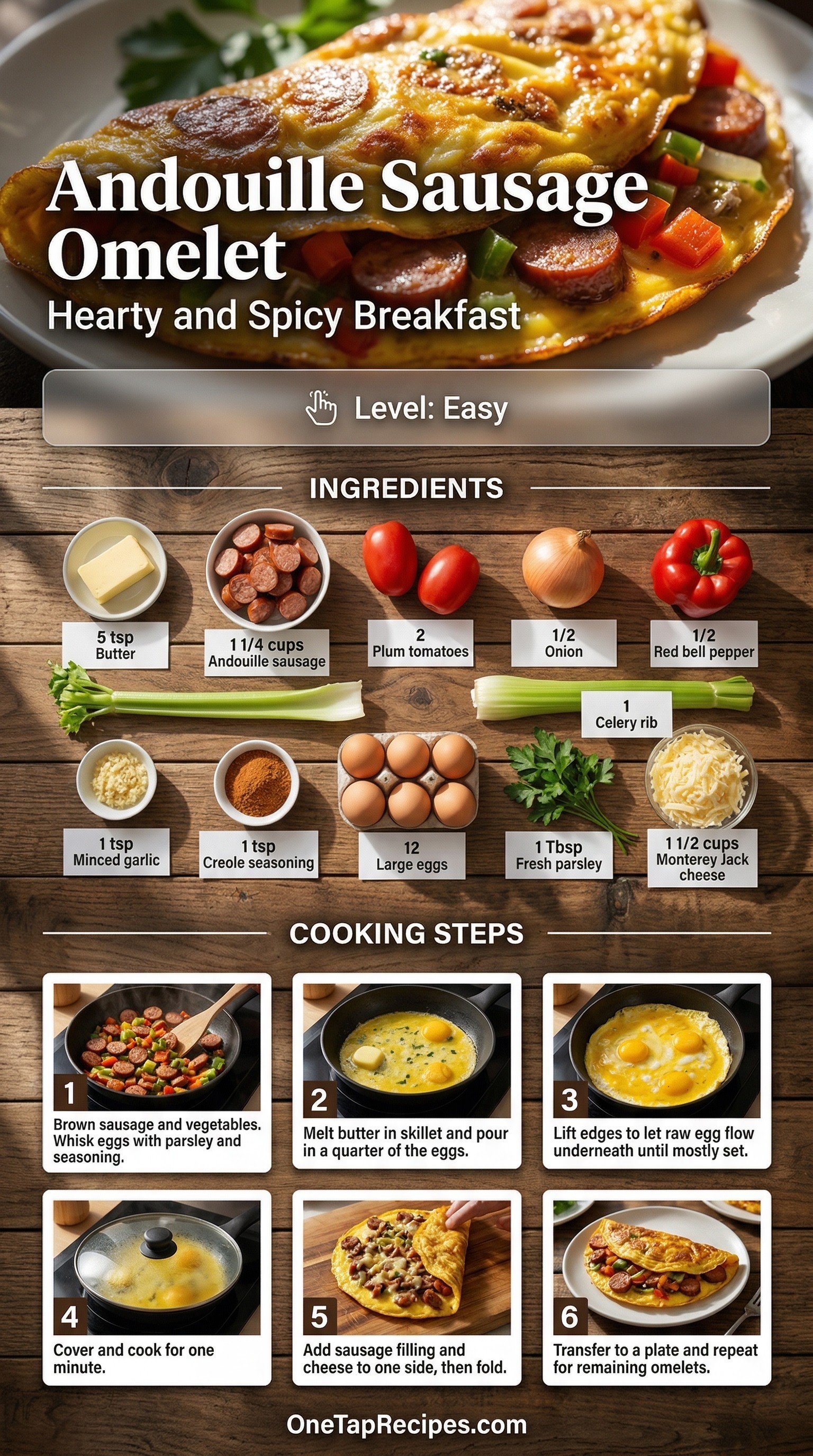 A hearty stovetop omelet filled with spicy andouille sausage, fresh vegetables, and melted Monterey Jack cheese. The savory filling combines bell peppers, onions, tomatoes, and Creole seasoning for a bold flavor profile. It works perfectly for a filling weekend brunch or a quick, protein-packed dinner. Fluffy eggs wrap around the smoky meat and tender vegetables to create a satisfying meal.
