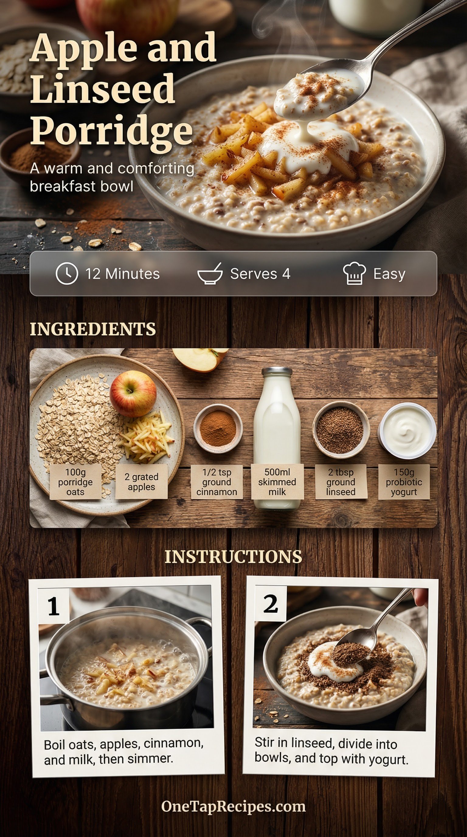 Start your morning with a warm bowl of apple and linseed porridge. Grated fresh apples and ground cinnamon cook directly into the oats to create a naturally sweet and comforting breakfast. Ground linseed adds a mild nutty flavor and blends seamlessly into the creamy milk base. A final spoonful of probiotic yogurt brings a bright tang to balance the rich spices. It comes together quickly on the stovetop for a satisfying weekday meal.