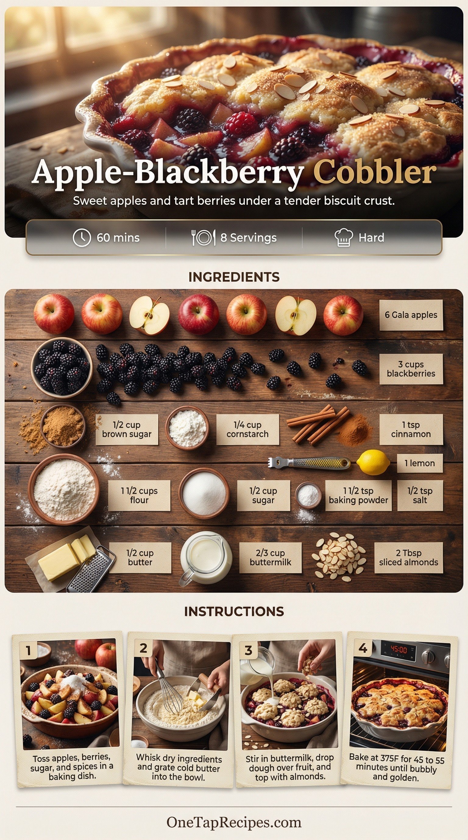 A warm, comforting fruit dessert featuring sweet Gala apples and tart fresh blackberries baked under a tender biscuit topping. The filling is brightened with fresh lemon zest and cinnamon, while the buttermilk biscuit dough gets a crunchy finish from sliced almonds. It makes a wonderful weekend baking project or a cozy dessert for family dinners. The bubbling fruit juices thicken perfectly beneath the golden, buttery crust.
