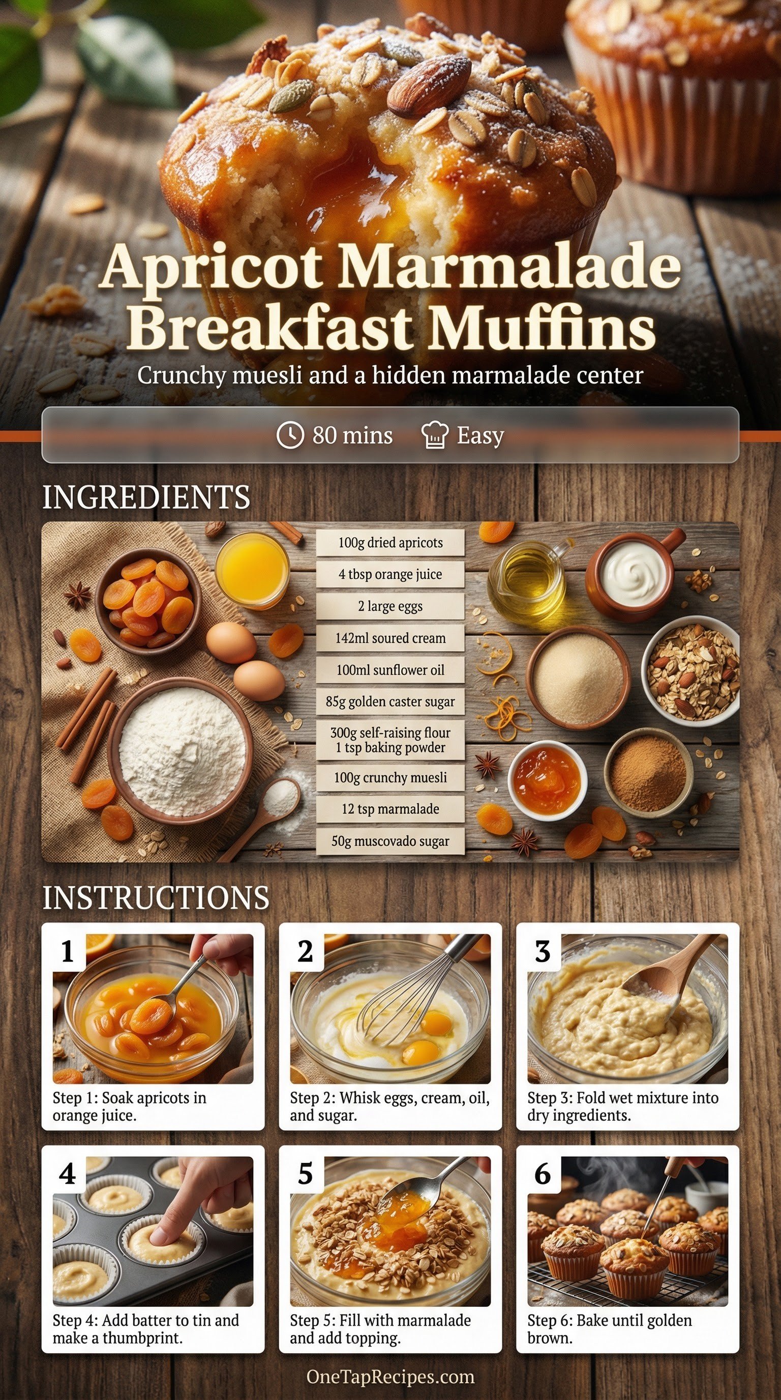 These hearty breakfast muffins feature dried apricots, crunchy muesli, and a hidden center of sweet marmalade. Soured cream keeps the crumb moist, while a simple muesli topping adds a satisfying crunch to every bite. They are perfect for a quick weekday morning or a relaxed weekend brunch. Bright citrus notes from the orange juice and marmalade pair beautifully with the earthy oats and seeds.