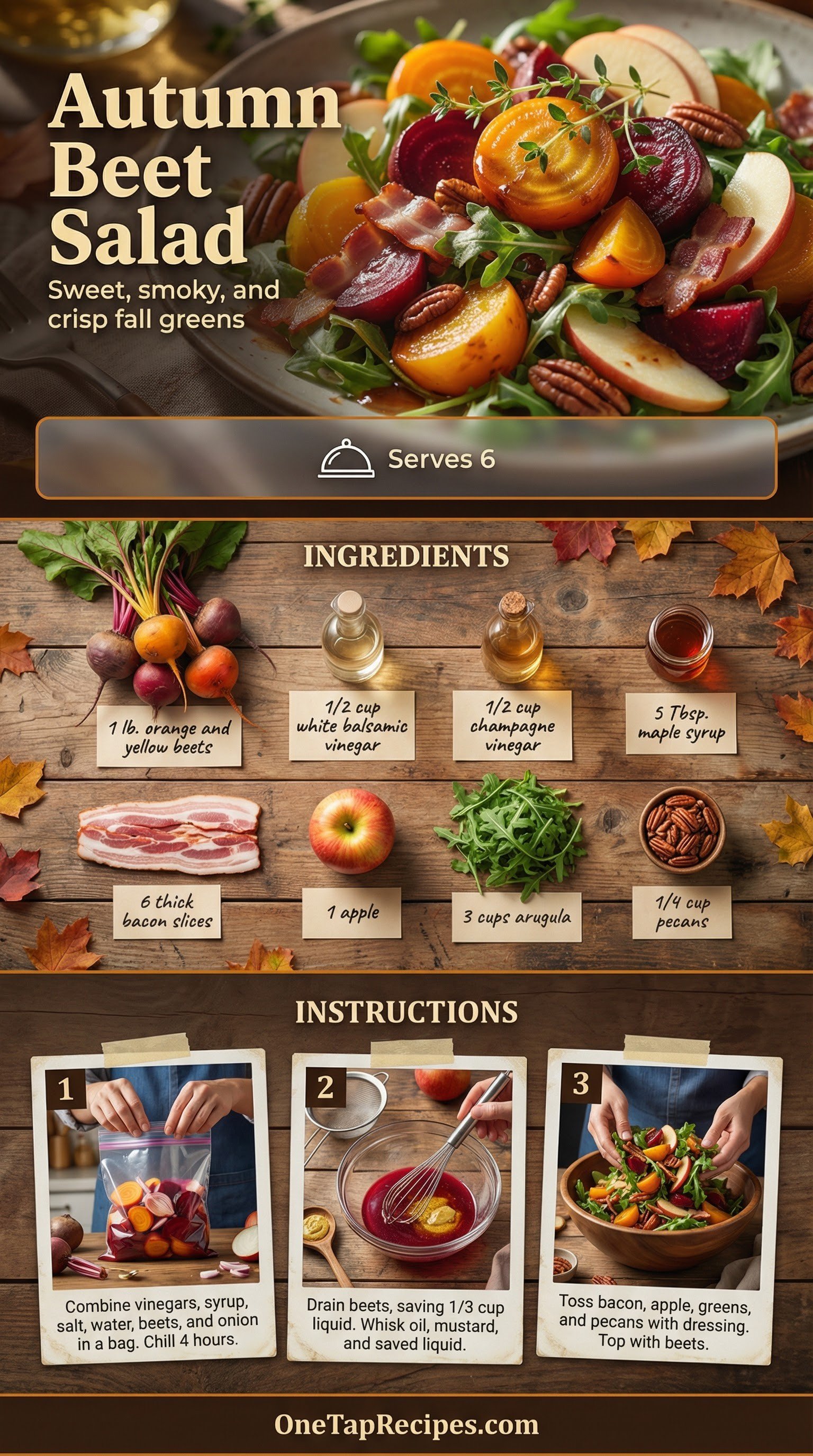 A bright mix of orange and yellow beets forms the base of this crisp fall salad. The beets and sweet onions marinate in a blend of champagne and white balsamic vinegars sweetened with maple syrup. Smoky applewood bacon, toasted pecans, and thin slices of crisp apple add deep savory notes and crunch. Fresh arugula and green leaf lettuce bring a peppery bite to the bowl. Serve it as a colorful starter for a holiday dinner or a hearty weekend lunch.