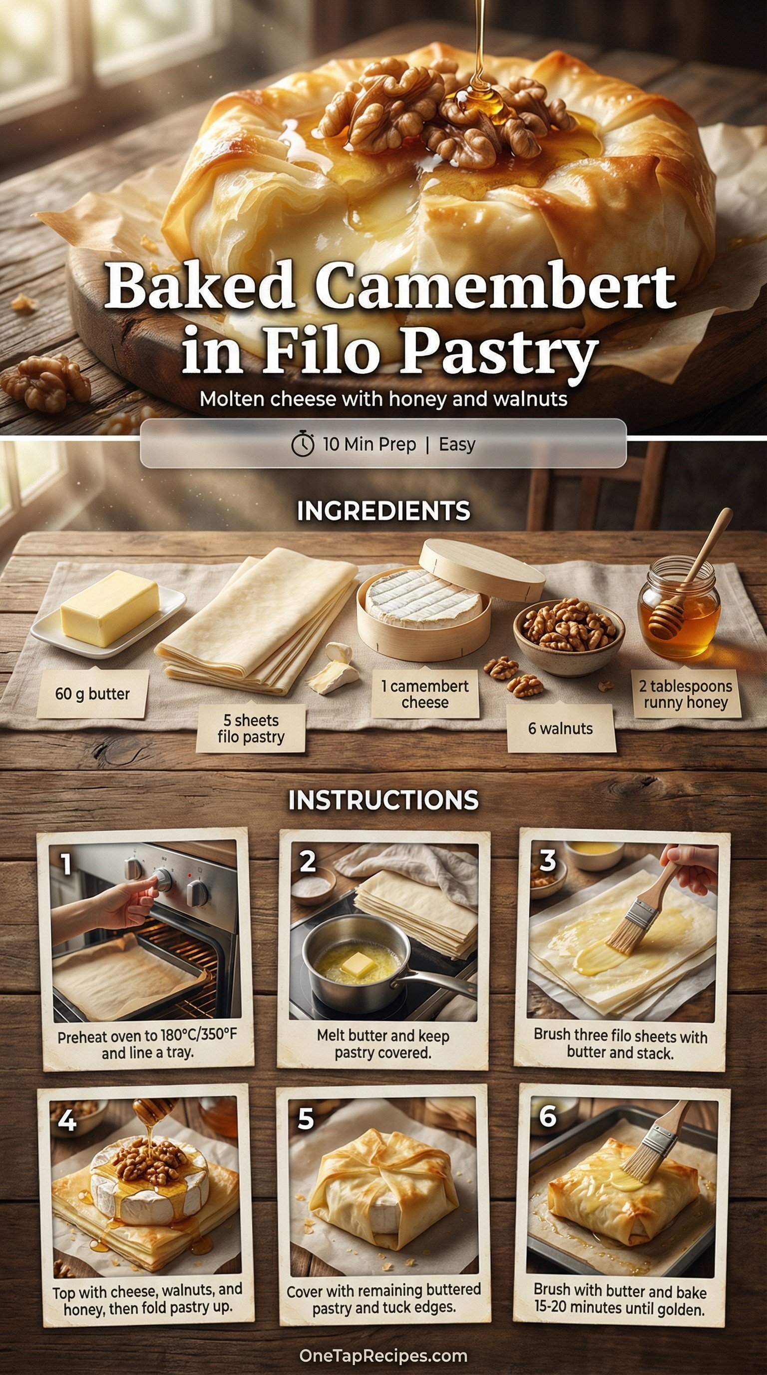 This elegant appetizer features a whole camembert cheese wrapped in crisp, golden filo pastry. It combines the rich, savory flavor of melted cheese with sweet honey and crunchy walnuts. The contrast between the flaky exterior and the molten, creamy center makes it an irresistible starter. It is an excellent choice for holiday entertaining or a cozy weekend gathering.