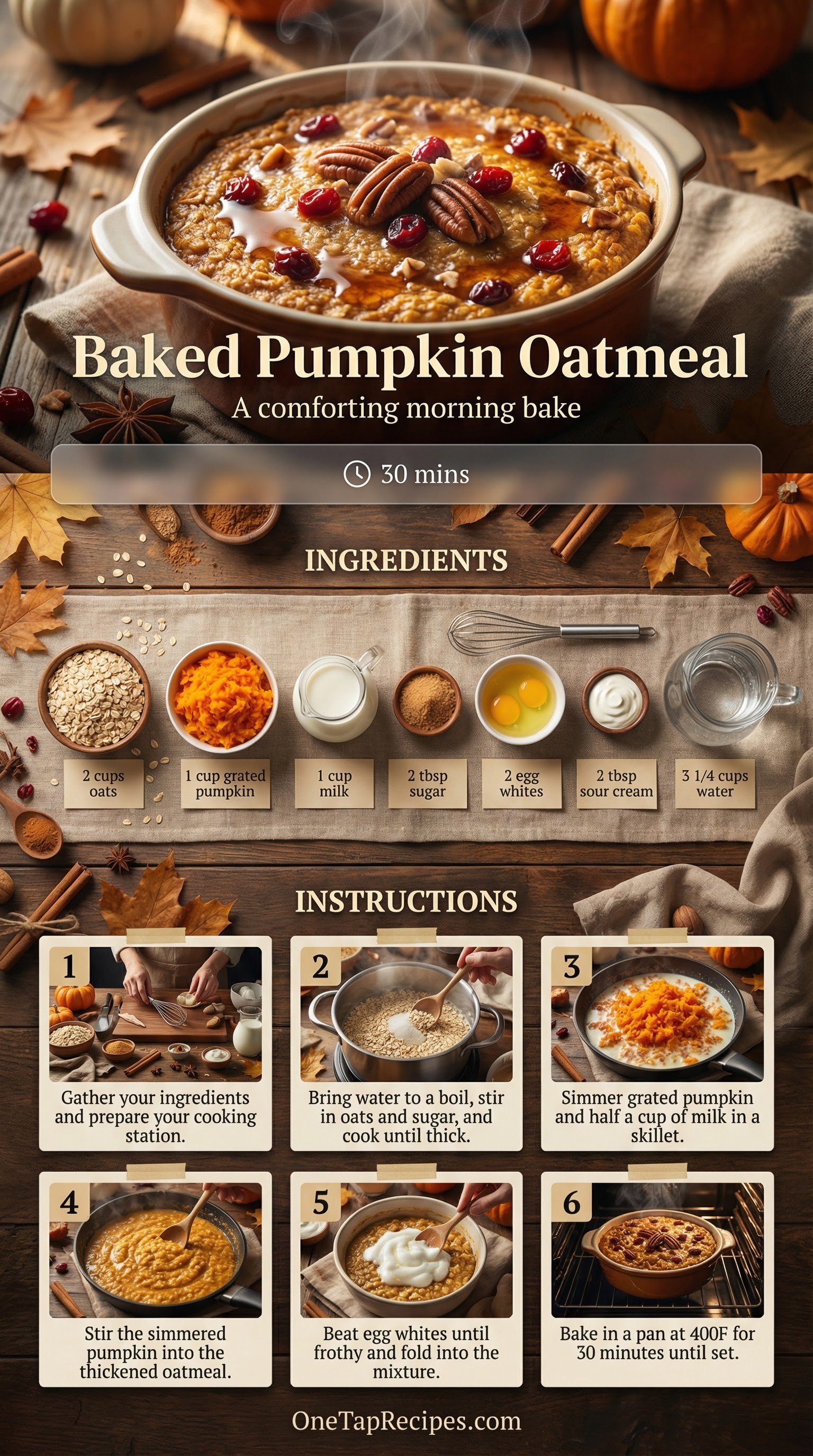 This warm baked oatmeal is made with freshly grated pumpkin for a comforting morning meal. It combines stovetop-cooked oats with simmered pumpkin and whipped egg whites to create a light, fluffy texture. Serve it for a cozy fall breakfast or a weekend brunch. The hearty, lightly sweetened bake pairs beautifully with a dollop of sour cream.