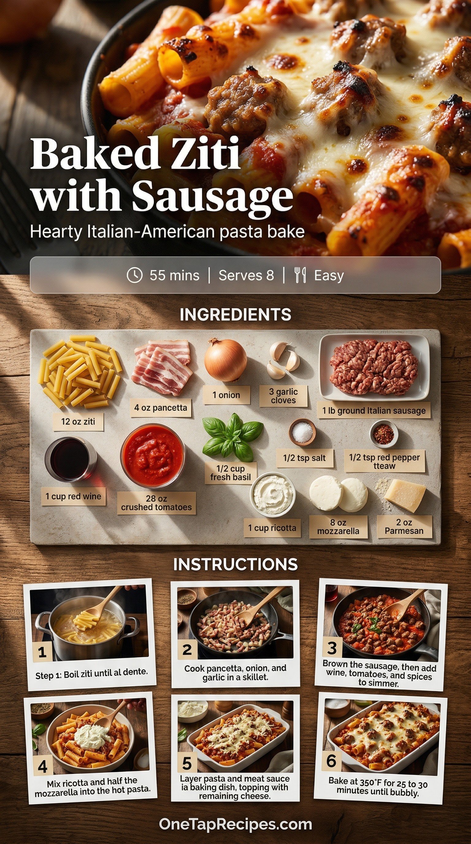 Baked ziti with sausage is a hearty Italian-American classic that brings everyone to the table. The dish layers tender pasta with a rich meat sauce made from ground Italian sausage, diced pancetta, and crushed tomatoes. A splash of dry red wine adds depth to the savory tomato base, while fresh basil brightens the flavor. Ricotta and mozzarella melt directly into the hot pasta before baking, creating a creamy and comforting center. It is an ideal choice for a weekend family dinner or a casual gathering.