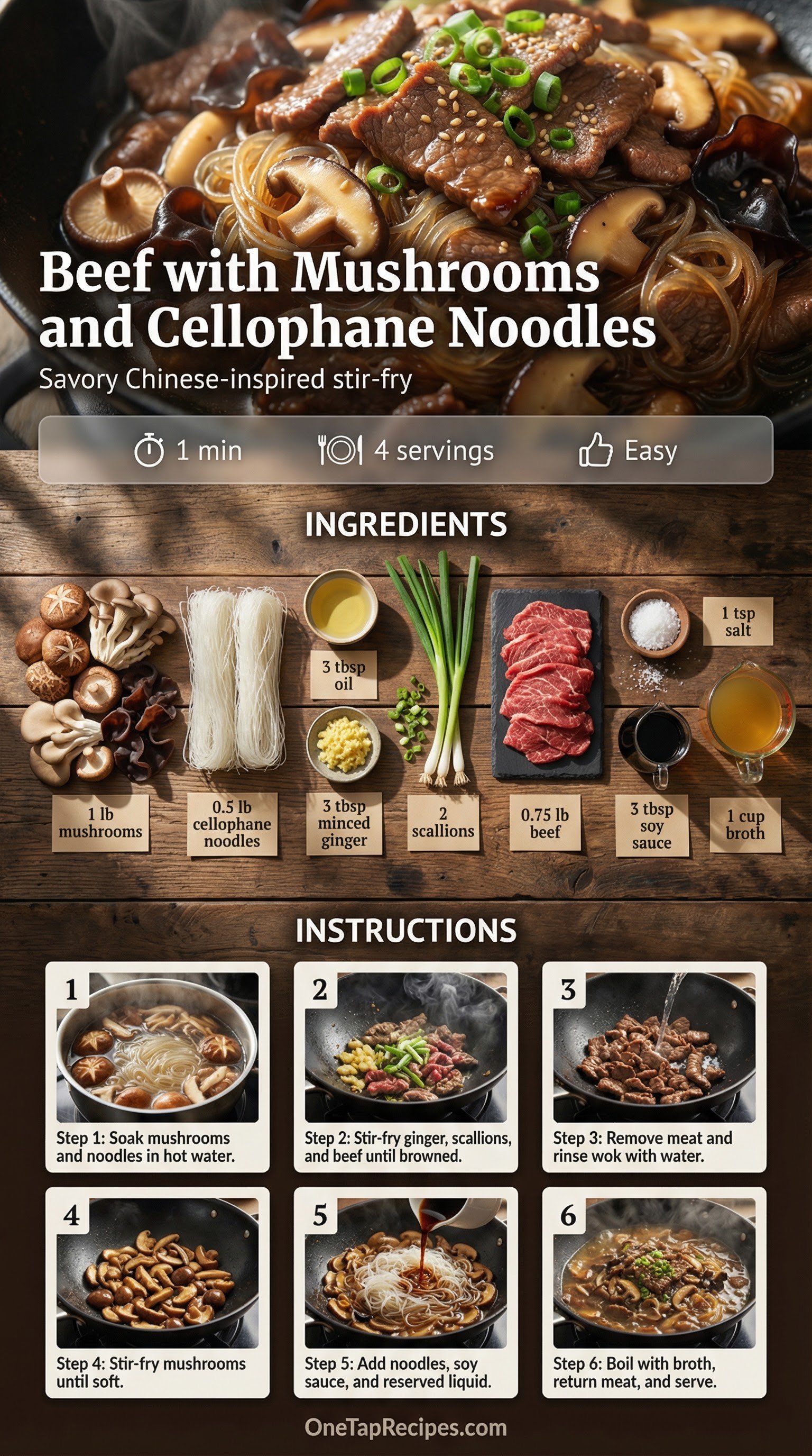 This savory stir-fry combines tender beef, earthy mushrooms, and slippery cellophane noodles in a rich, flavorful broth. Quick wok-cooking builds deep flavor by using the mushroom soaking liquid as a base for the sauce. The thin slices of beef cook rapidly alongside the ginger and scallions to keep everything tender. It makes a comforting weeknight dinner that delivers a satisfying mix of chewy textures and warm, savory notes.