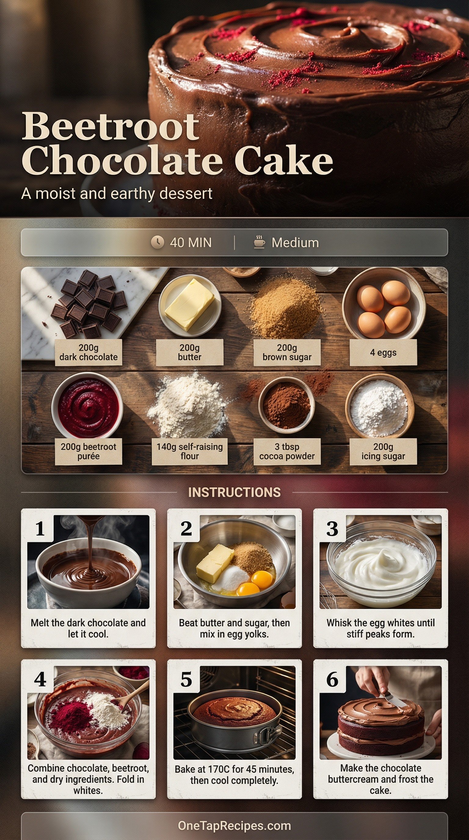 This rich chocolate cake uses puréed beetroot to create an incredibly moist and tender crumb. The earthy sweetness of the root vegetable pairs perfectly with dark chocolate for a deeply flavorful dessert. It is finished with a decadent chocolate buttercream frosting that ties the whole dish together. Serve this unique bake at your next afternoon tea or dinner party to surprise and delight your guests.