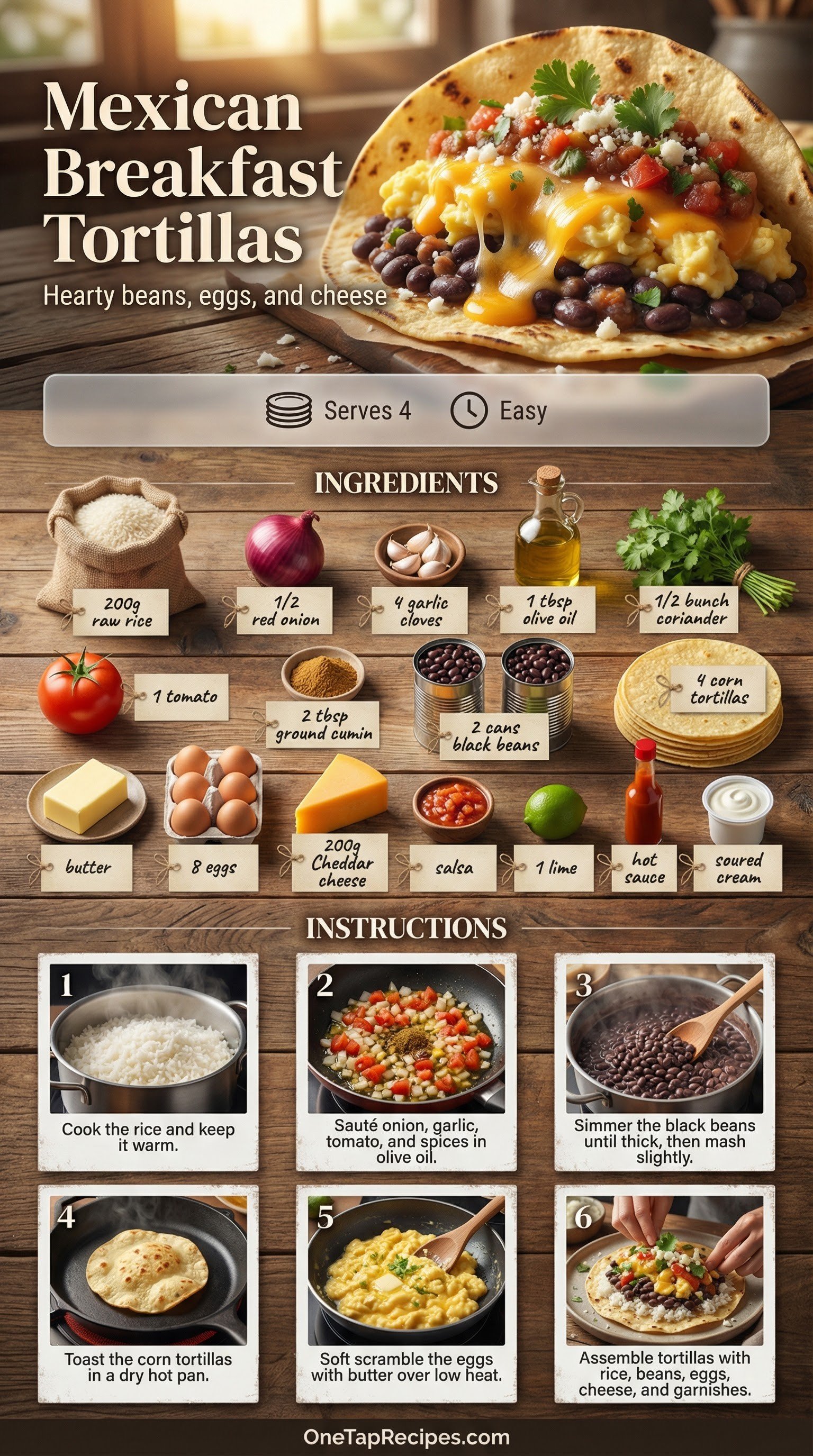 Creamy scrambled eggs and rich, spiced black beans create a deeply satisfying morning meal. You'll layer these savory staples over warm corn tortillas and tender rice for a breakfast that'll keep you full well past noon. The homemade bean mixture simmers with cumin, garlic, and fresh tomatoes, building layers of flavor while the rice cooks. Finish your plate with bright pops of fresh salsa, grated cheddar, and a squeeze of lime to balance the richness.