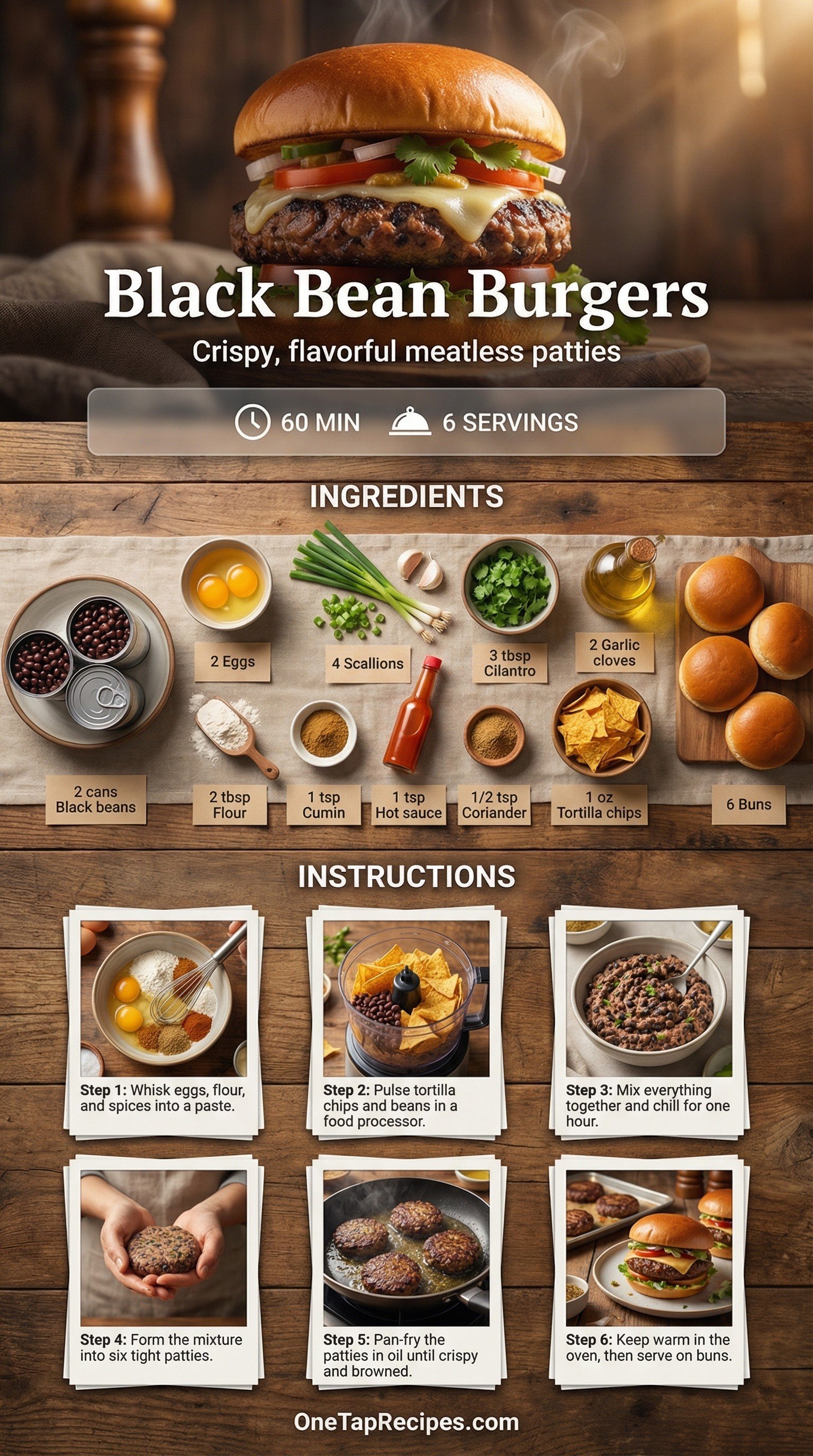 These hearty black bean burgers get their structure and crunch from crushed tortilla chips. The patties are seasoned with fresh cilantro, minced scallions, cumin, and coriander for a savory, slightly smoky flavor. A quick pan-fry in vegetable oil creates a crispy exterior that holds up perfectly on a toasted bun. They make an excellent meatless option for weeknight dinners or casual weekend gatherings. Serve them hot with your favorite burger toppings.