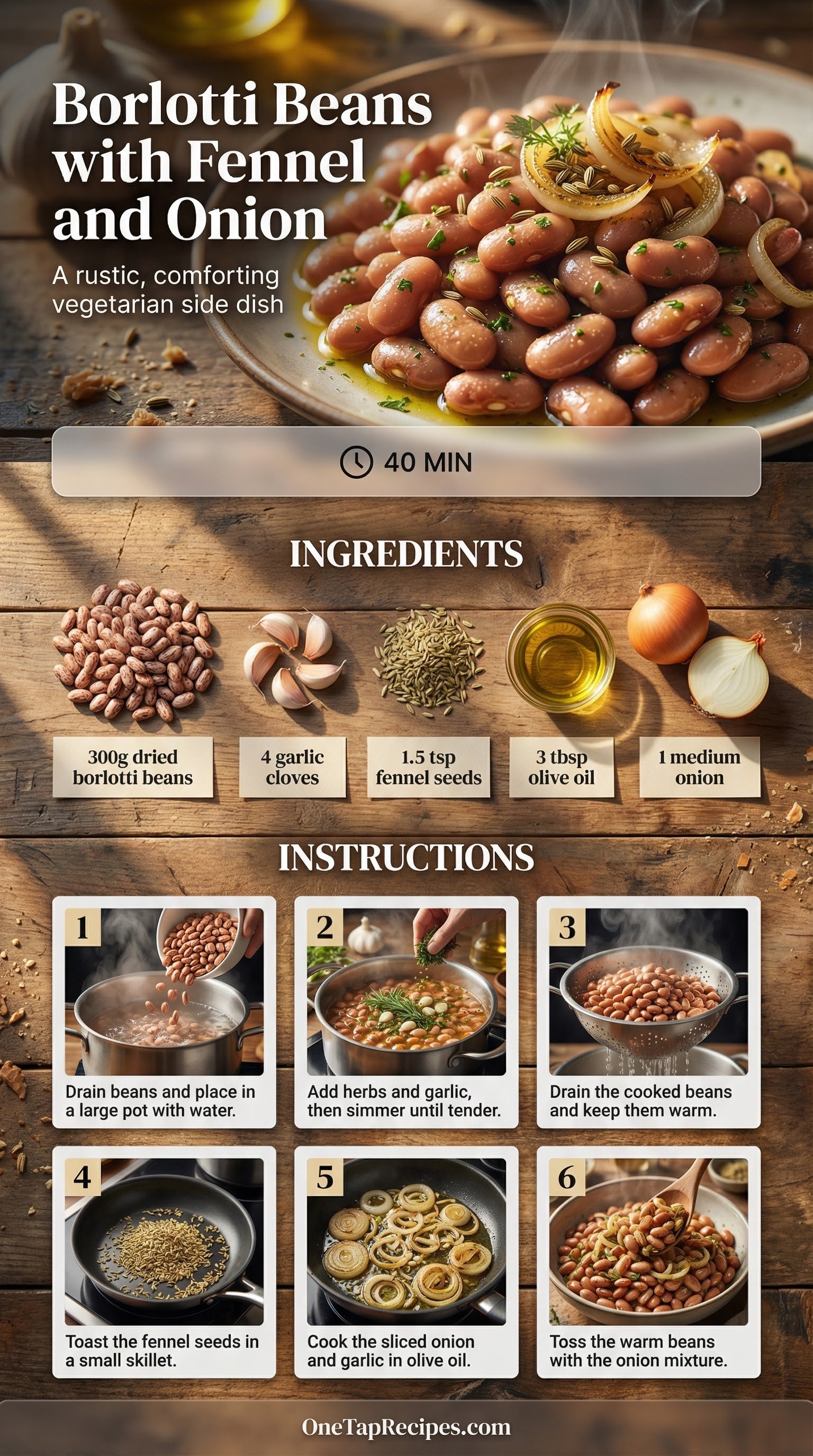 The secret here is cooking the beans from scratch, which gives them a creamy, rich texture that canned versions just can't match. Tender borlotti beans pair beautifully with sweet onions and toasted fennel seeds in this rustic dish. The toasted seeds add a warm, aromatic note that balances the savory garlic and gently cooked onions. Serve these beans as a hearty side dish, or enjoy them as a vegetarian main course with a thick slice of crusty bread to soak up the flavorful oil.