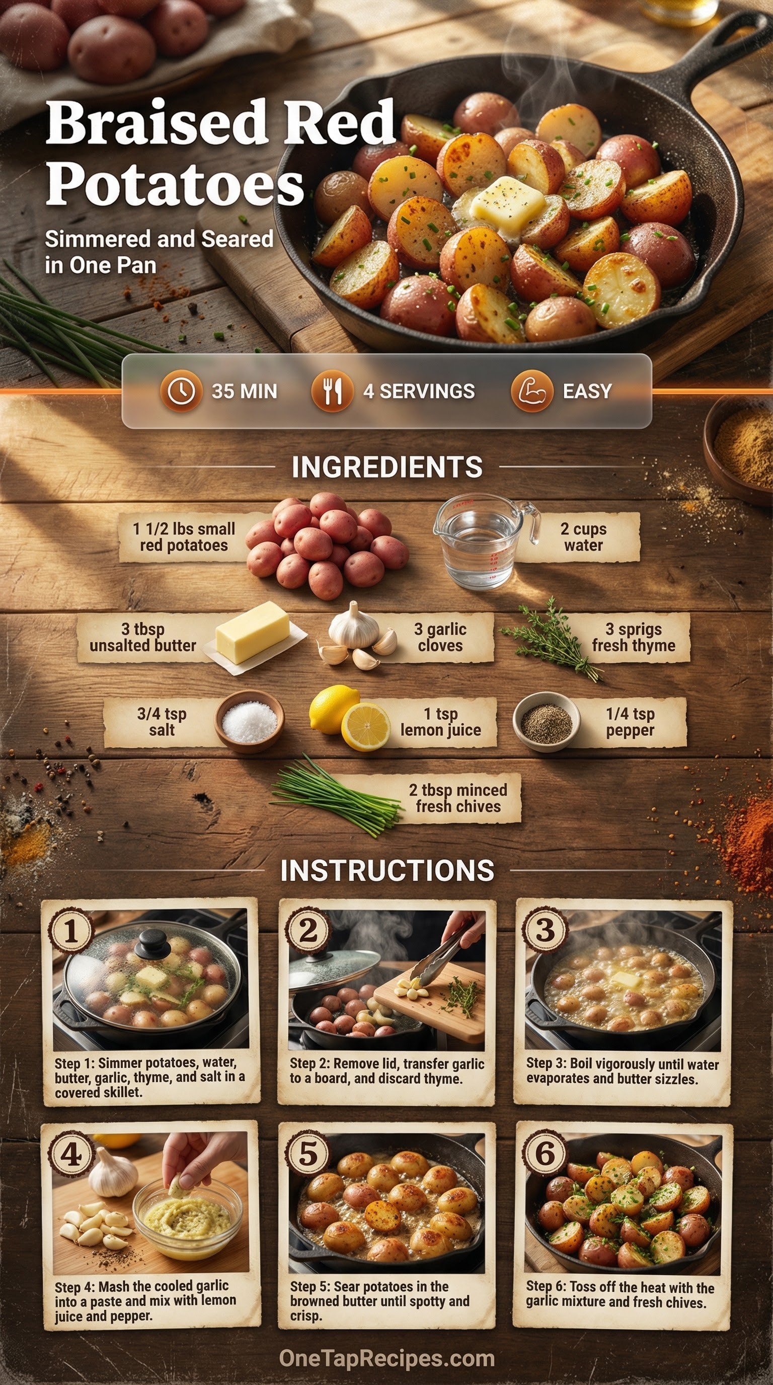 These small red potatoes cook entirely in one skillet for a side dish that is tender on the inside and deeply browned on the outside. The method starts with a gentle simmer in water and butter to soften the potatoes. As the water evaporates, the remaining butter browns and sears the cut sides to a crisp finish. A quick toss with mashed garlic, fresh chives, and a squeeze of lemon juice adds bright flavor right before serving.