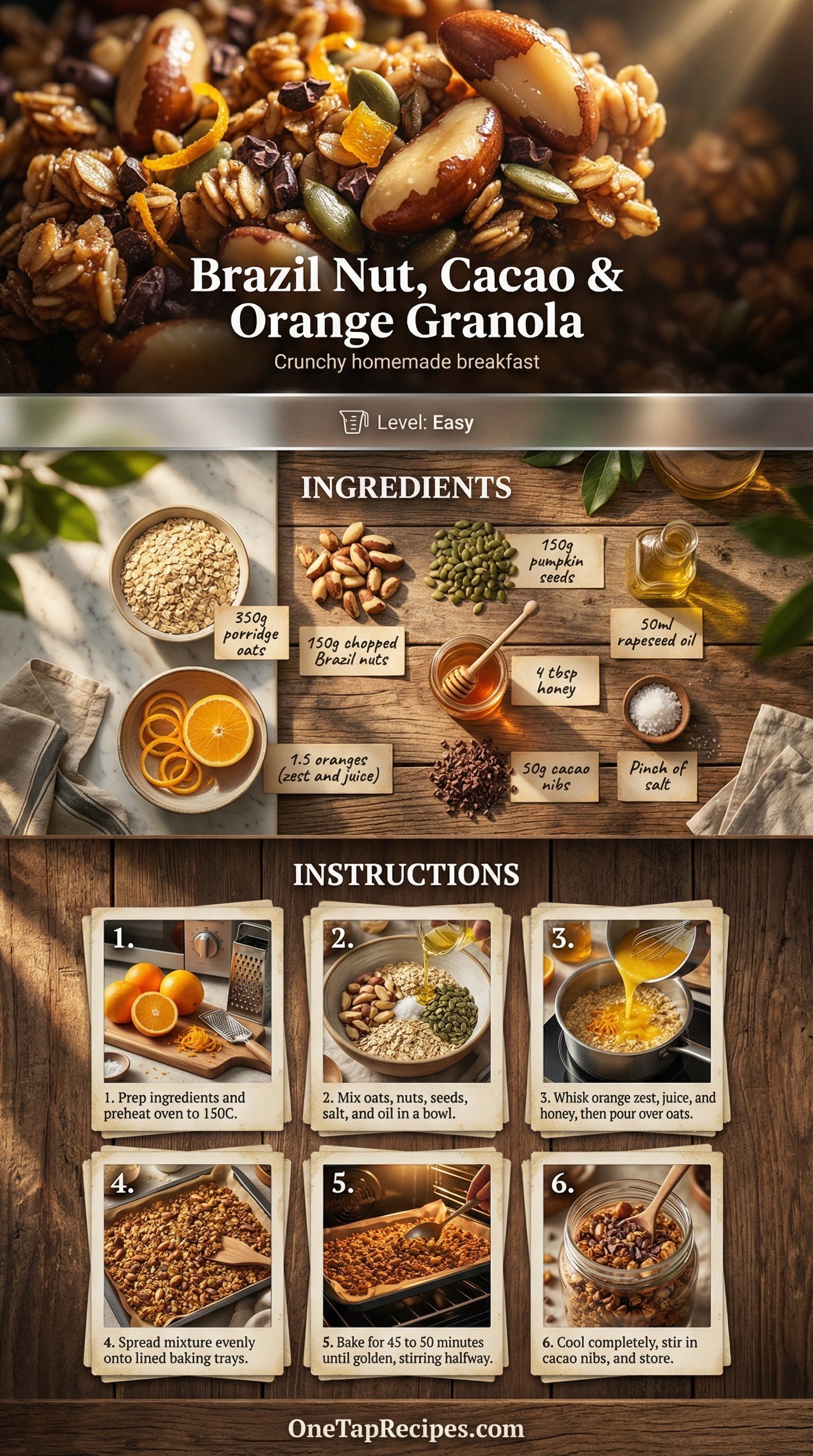 This homemade baked granola combines hearty oats with chopped Brazil nuts and crunchy seeds. Fresh orange juice and zest bring a bright citrus flavor that pairs perfectly with sweet honey and rich cacao nibs. It bakes up golden and crisp on a sheet pan. Serve a generous scoop over plain whole milk yogurt for a satisfying morning meal.