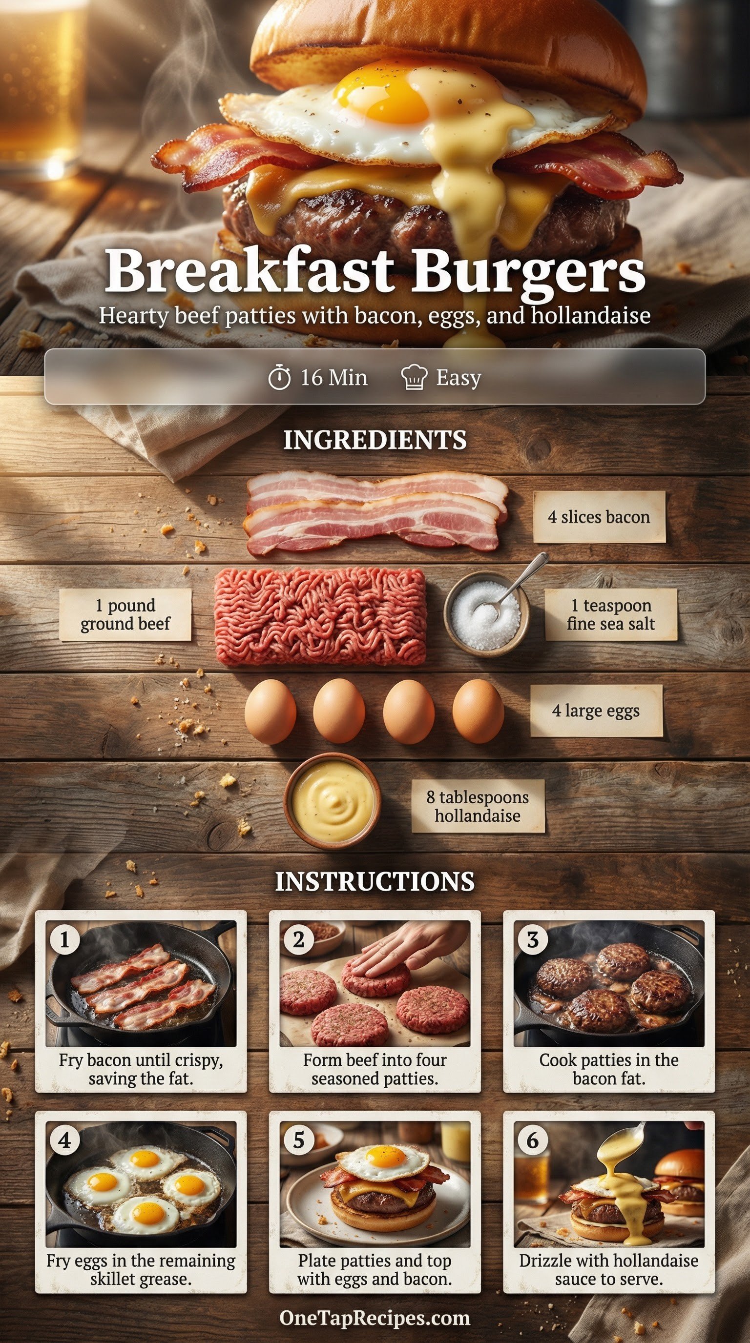 These hearty breakfast burgers stack seasoned ground beef patties with crispy bacon, fried eggs, and rich hollandaise sauce. Cooking the beef and eggs directly in the rendered bacon fat builds deep, savory flavor in every single layer without needing extra oil. It is a satisfying, high-protein meal perfect for a weekend brunch or a filling start to a busy morning.