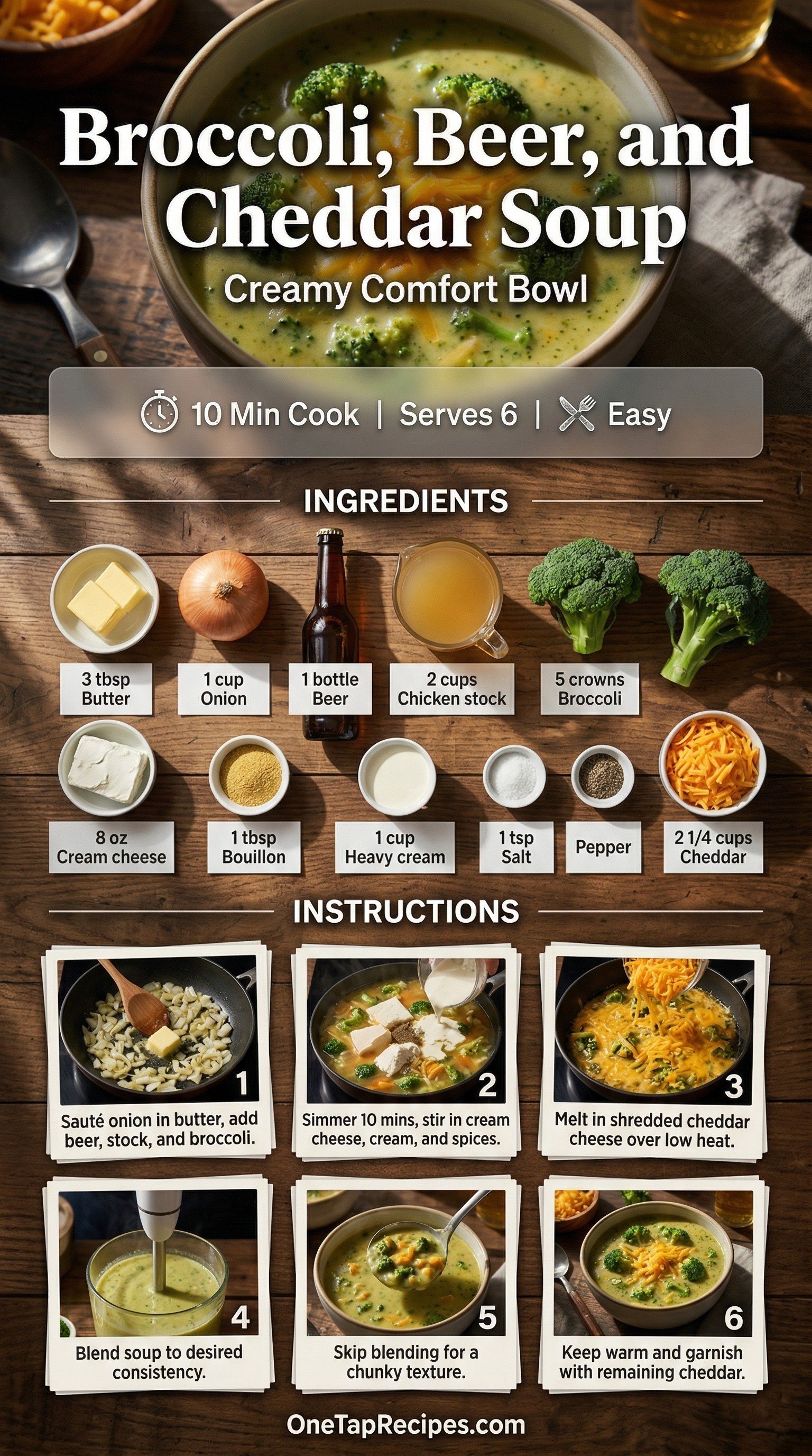A rich and creamy broccoli, beer, and cheddar soup brings together tender vegetables and a savory broth. The addition of cream cheese and heavy cream creates a luxurious texture, while your favorite beer adds a deep, malty background note. It makes a comforting weeknight dinner, especially when ladled into a hollowed-out bread boule. Sharp cheddar melts smoothly into the base, delivering a bold and satisfying finish to every spoonful.