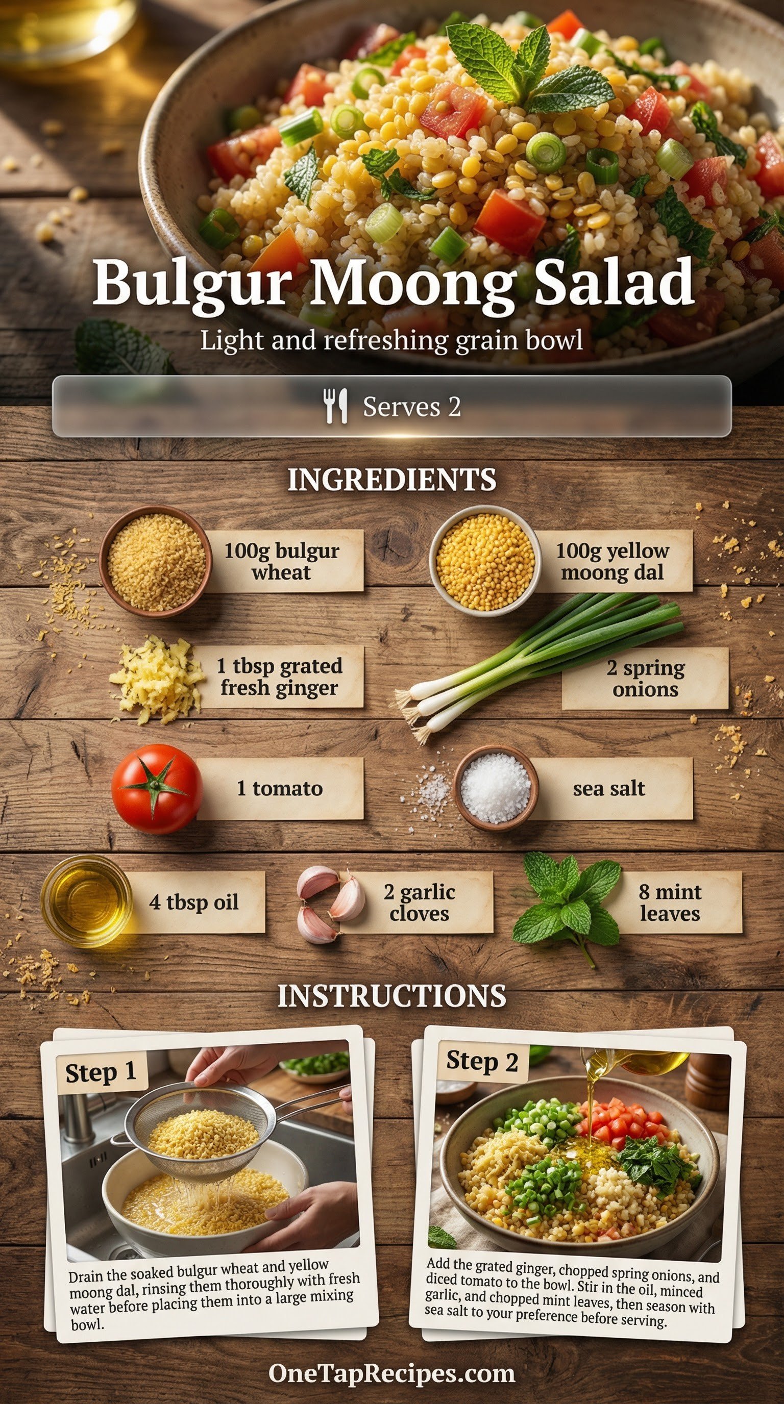 A refreshing blend of soaked bulgur wheat and yellow moong dal creates a light, nutrient-dense salad. Fresh ginger, diced tomatoes, and crisp spring onions add bright, crunchy textures to the earthy grains. A simple dressing of oil, minced garlic, and chopped mint leaves ties the bowl together with a clean, herbaceous finish. It is an excellent budget-friendly side dish to balance out heavier main courses. Serve it chilled or at room temperature for a quick, wholesome addition to your weekly meal rotation.