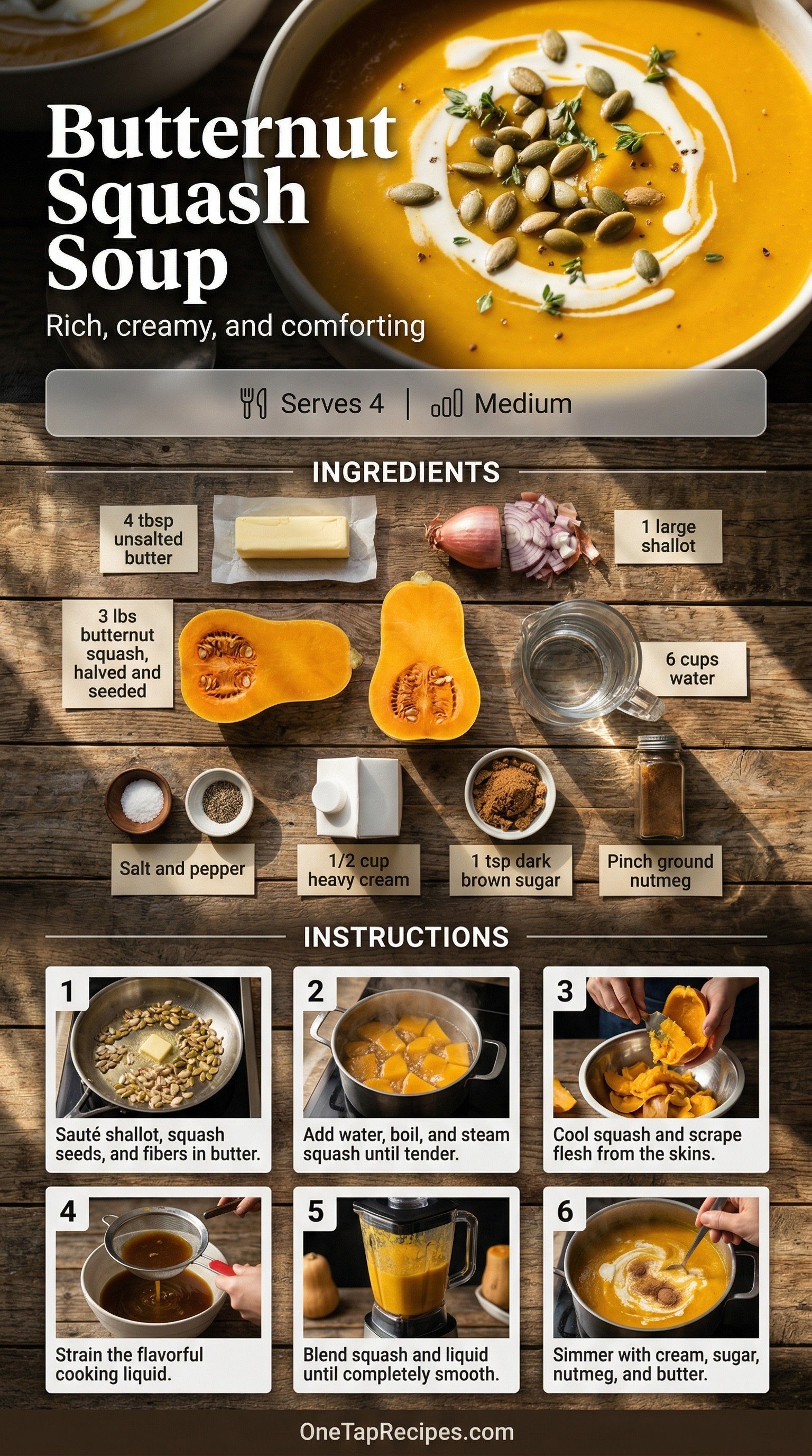 This comforting butternut squash soup builds deep flavor by using the often-discarded seeds and fibers to season the base broth. The squash steams gently over this savory liquid until completely tender. Blended until smooth, the soup finishes with a splash of heavy cream, a hint of dark brown sugar, and a pinch of nutmeg. It is an ideal warming meal for crisp autumn evenings.