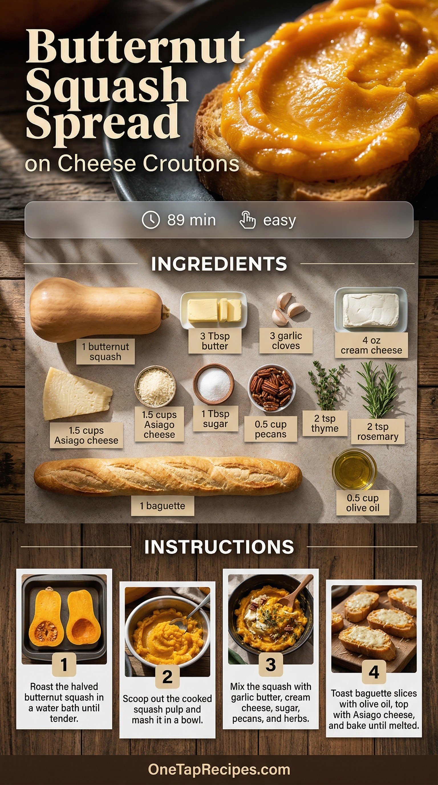 This creamy butternut squash spread served over crispy Asiago cheese croutons makes a fantastic appetizer. Roasted squash blends with garlic butter, cream cheese, and toasted pecans to create a rich, savory topping. Fresh thyme and rosemary add a layer of earthy flavor that balances the natural sweetness of the squash. Serve this warm, comforting dish at your next holiday gathering or winter dinner party. The smooth spread contrasts perfectly with the crunchy, cheesy toasted baguette slices.