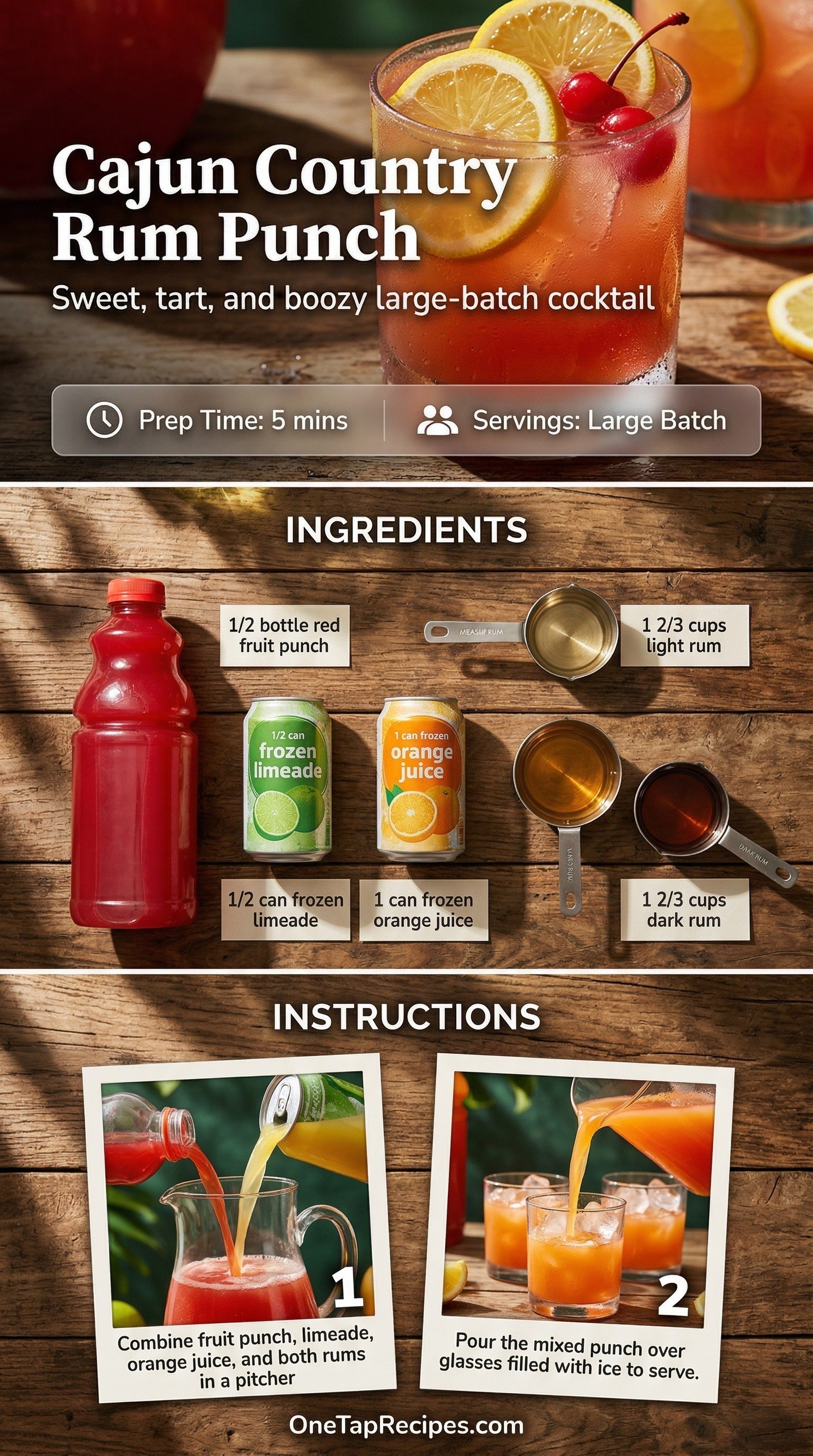 A staple of southern Louisiana celebrations, this large-batch rum punch brings lively spirit straight to your glass. It mixes both light and dark rum with sweet red fruit punch and a heavy hit of tart citrus. Relying on frozen limeade and orange juice concentrates keeps the prep incredibly fast while delivering bold, refreshing flavor. You'll want to serve it well-chilled over plenty of ice to balance the sweet and punchy notes.