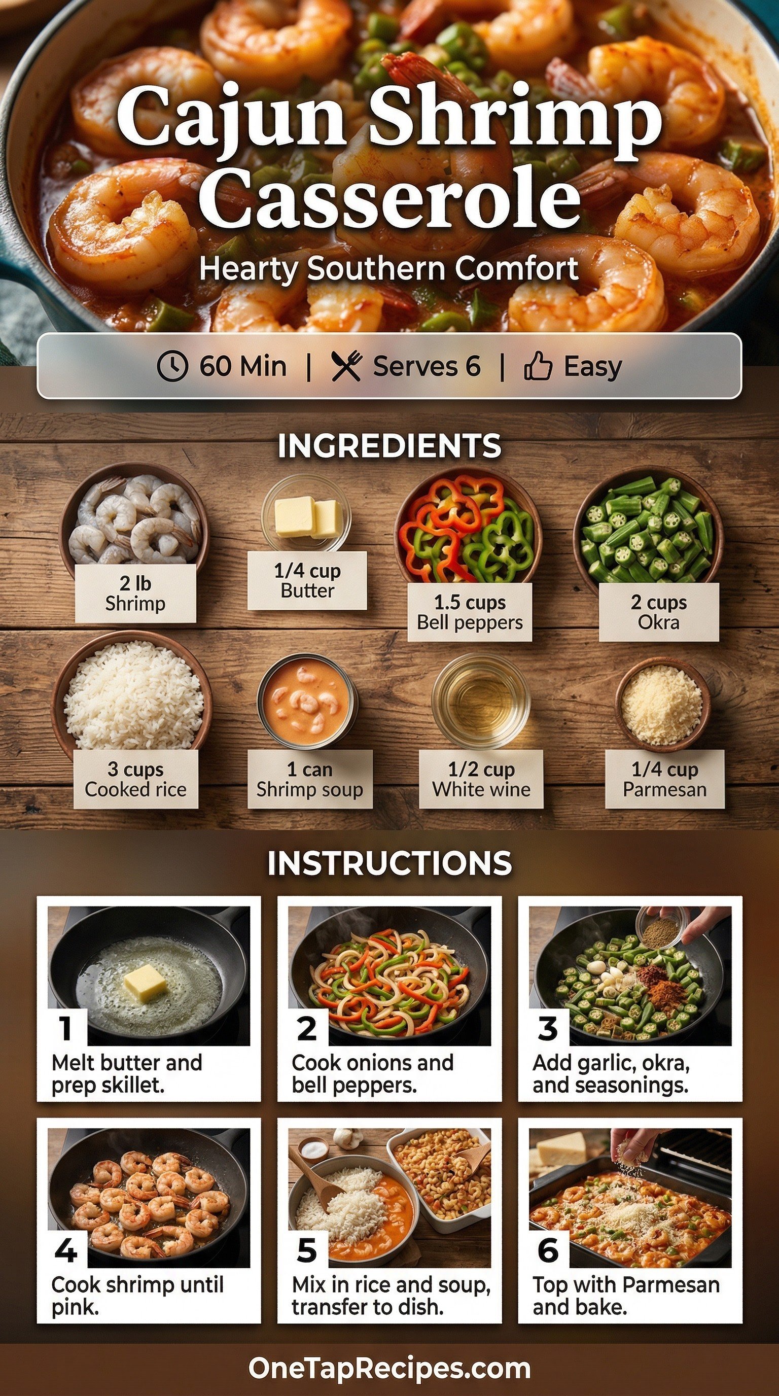Cajun Shrimp Casserole is a hearty baked dish packed with tender shrimp, colorful bell peppers, and sliced okra. This comforting meal brings together classic Southern flavors in a single baking dish. A creamy base made with white wine, soy sauce, and a touch of cayenne pepper coats every bite of long-grain rice. A sprinkle of grated Parmesan cheese adds a savory, golden crust on top. It makes an excellent weeknight dinner when you want something warm and satisfying.