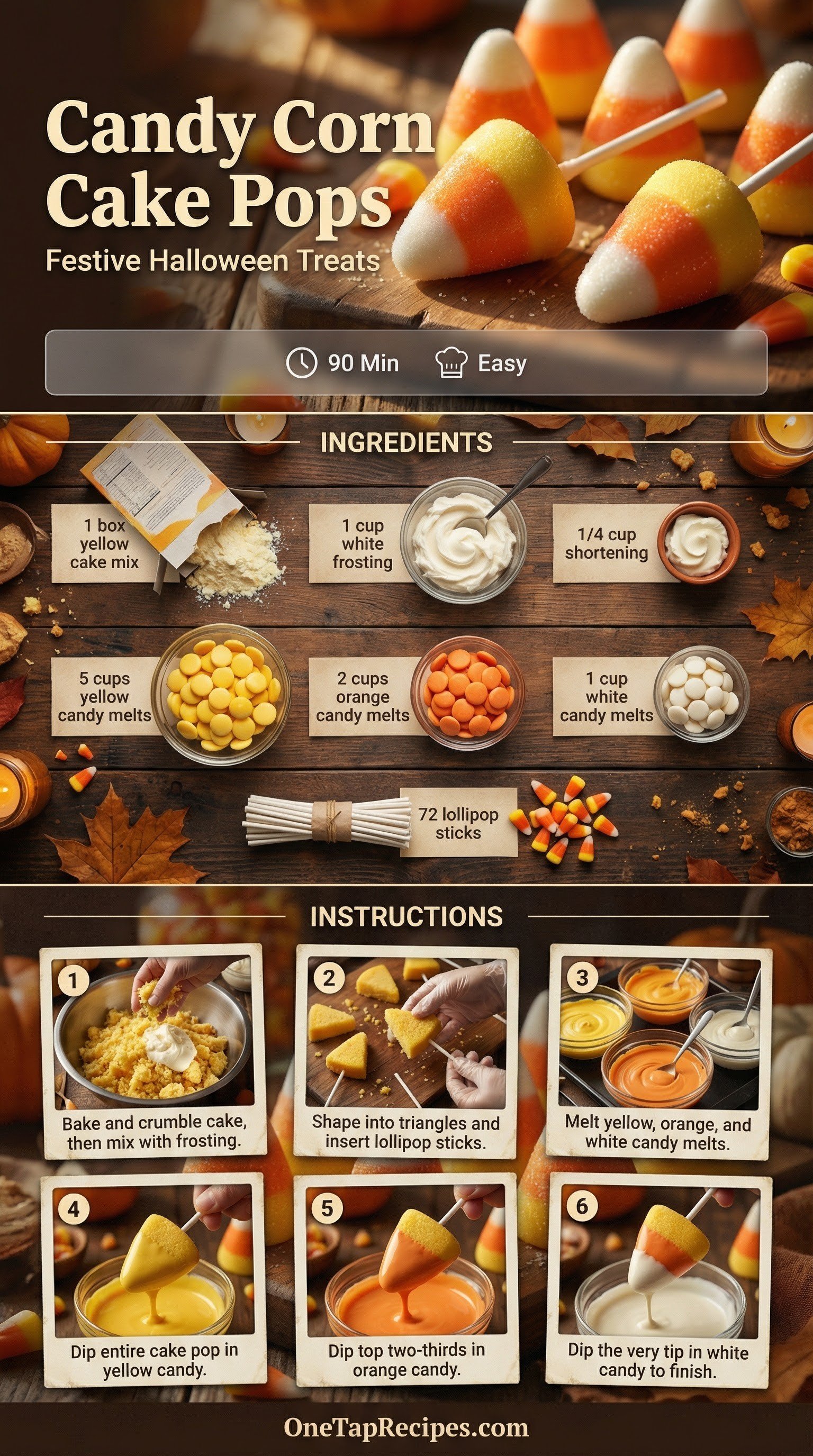 These bite-sized cake pops are shaped and decorated to look just like classic candy corn. A simple base of baked yellow cake and fluffy white frosting creates a sweet, dense center. Each piece is dipped in layers of yellow, orange, and white candy melts for a crisp, colorful shell. They are a fun, festive treat to serve at Halloween parties or autumn gatherings.
