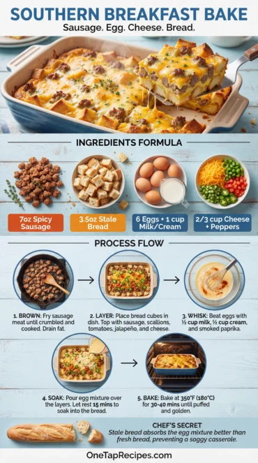 This hearty brunch casserole combines spicy sausage, sharp cheese, and crusty bread custard for a crowd-pleasing meal. It comes together quickly and can even be …
