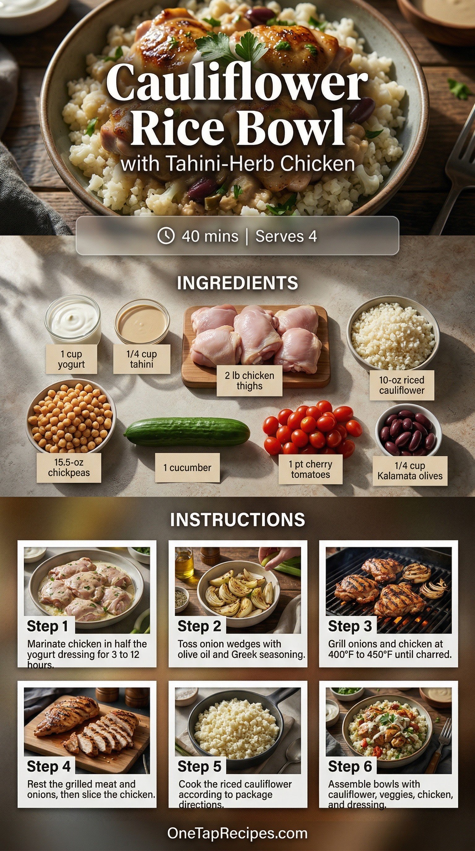 A fresh Mediterranean-inspired bowl pairs tender grilled chicken with a light cauliflower rice base. The secret to this dish is a bright tahini and herb yogurt blend that works double duty as both a rich marinade and a creamy finishing dressing. Crisp cucumbers, cherry tomatoes, and briny Kalamata olives add a satisfying crunch and burst of acidity. It is an excellent choice for a healthy weeknight dinner or a pre-planned weekday lunch.