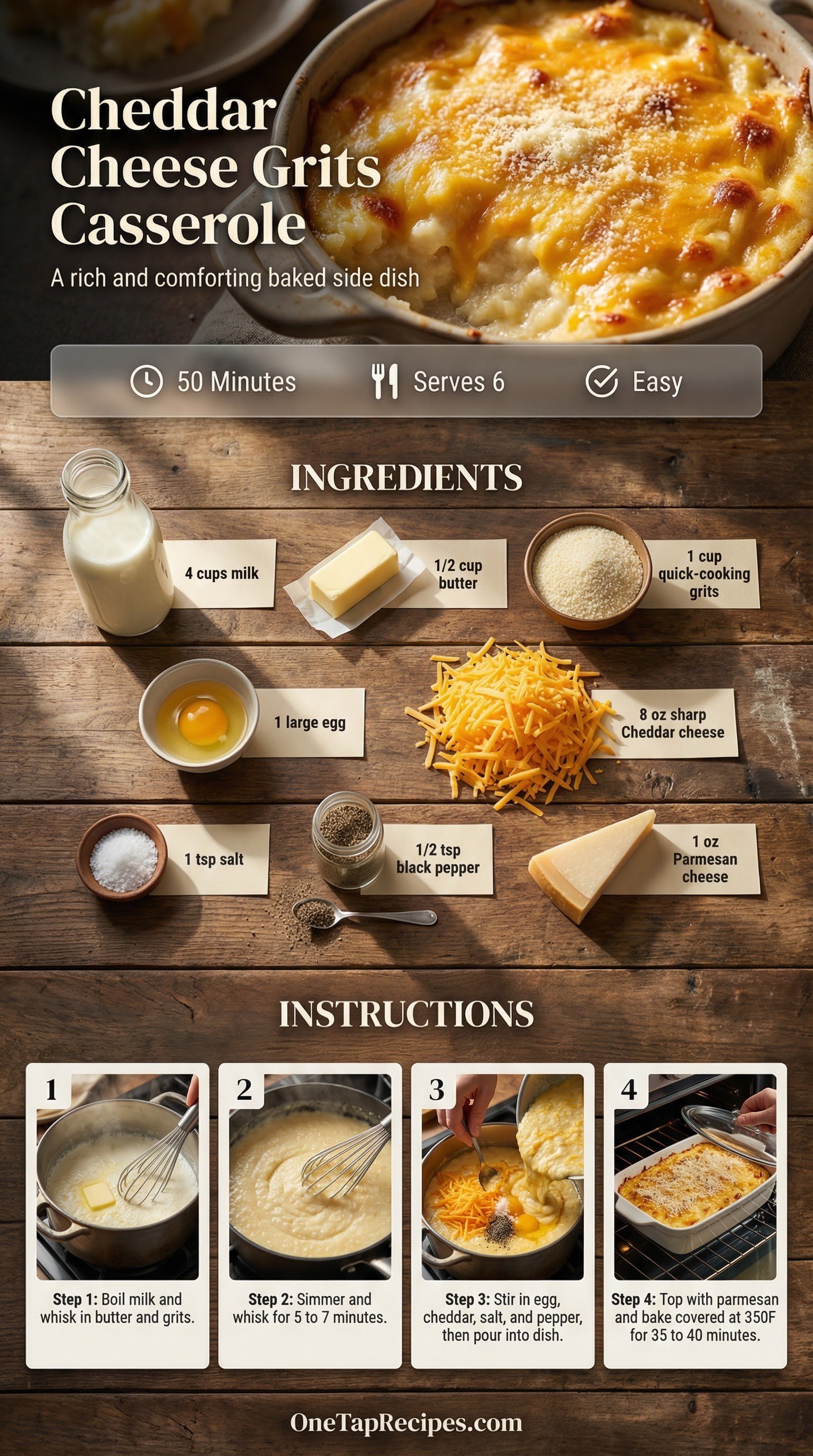 This baked dish transforms simple quick-cooking grits into a rich, comforting side. Sharp cheddar and parmesan melt together with butter and milk to create a deeply savory flavor profile. The addition of a lightly beaten egg gives the casserole a beautifully set, sliceable texture straight from the oven. It works perfectly as a hearty addition to a weekend brunch spread or a cozy weeknight dinner.