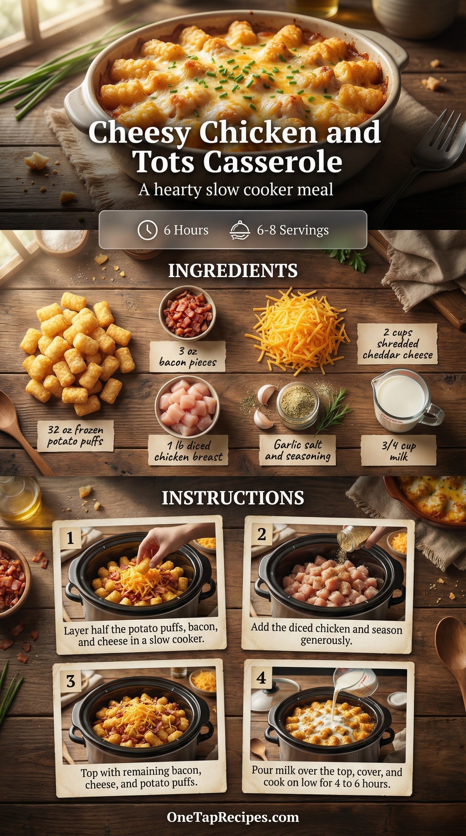 This comforting slow cooker casserole layers tender diced chicken with crispy potato puffs, smoky bacon, and melted cheddar cheese. It is a hearty, hands-off meal that requires minimal prep work before the slow cooker takes over. The combination of savory steak seasoning and rich cheese creates a satisfying dish perfect for busy weeknights.