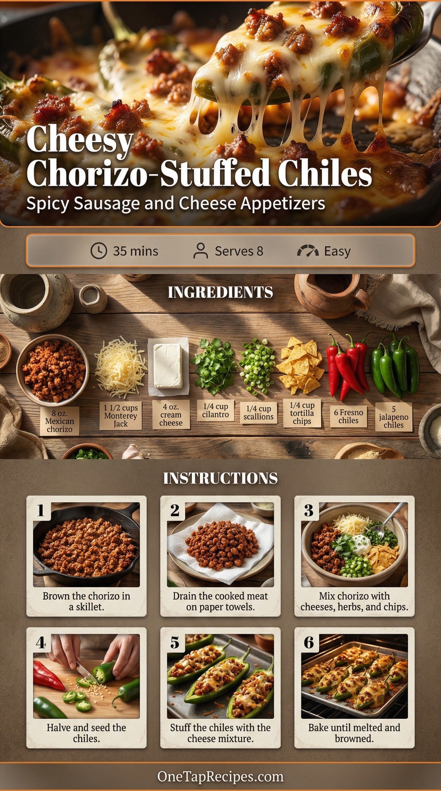 These savory appetizers feature fresh Mexican chorizo and melted cheese packed into bright red Fresno and green jalapeno peppers. The filling combines creamy Monterey Jack and cream cheese with crushed tortilla chips for an unexpected crunch. These colorful stuffed peppers are an excellent choice for game day gatherings or casual weekend entertaining. The rich, spicy pork sausage balances perfectly against the creamy cheese and the roasted heat of the fresh chiles.