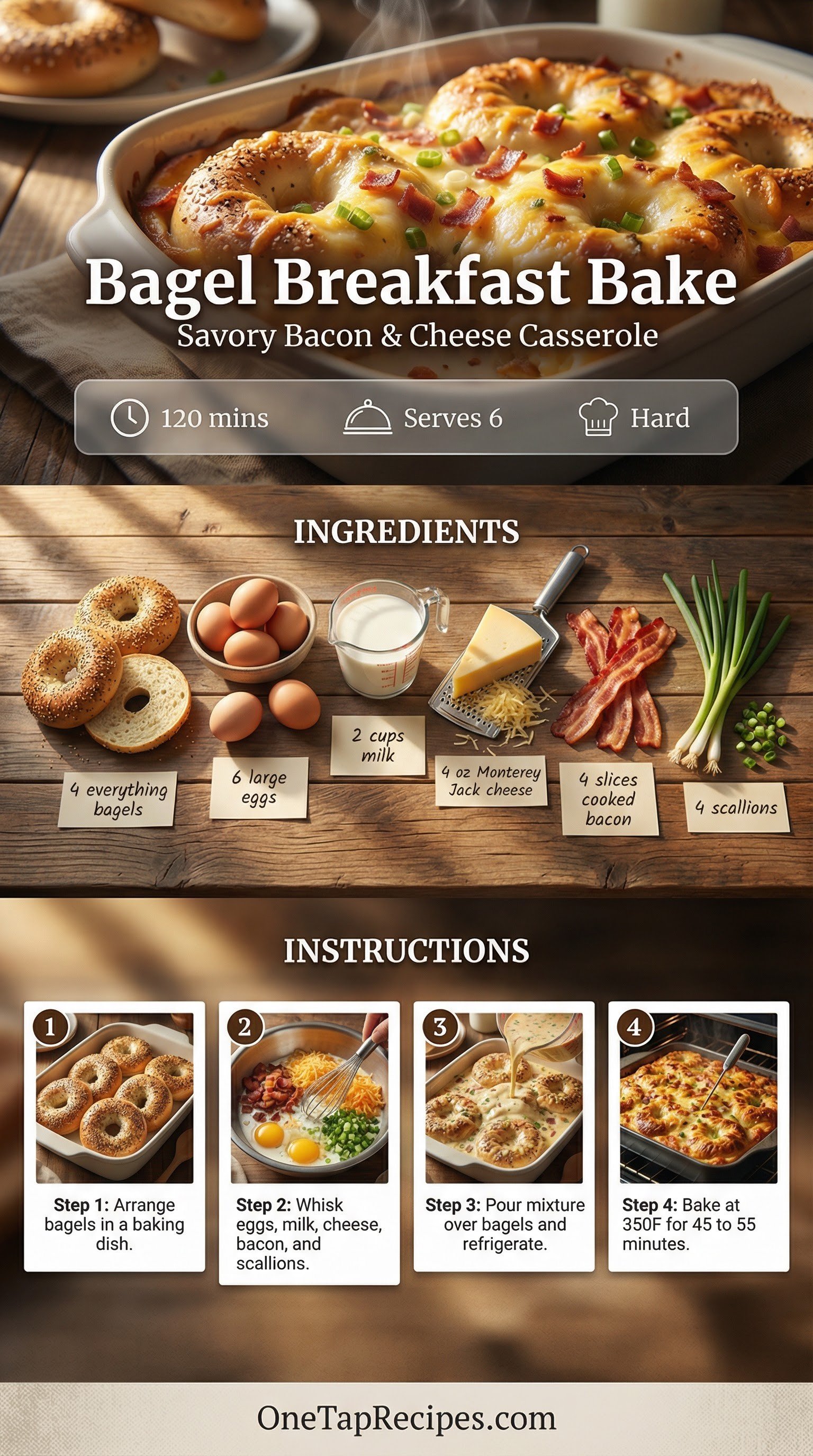 Salty bites of crisp bacon and fresh scallions cut through the comforting, tender texture of this savory morning casserole. Built on a foundation of chopped everything bagels, the bread absorbs a rich custard of eggs, milk, and melted Monterey Jack cheese. It's a fantastic make-ahead option for weekend brunches or holiday mornings. You'll love how the bagels soften inside while keeping a slight chew on top. Just assemble it the night before and pop it in the oven when you wake up.