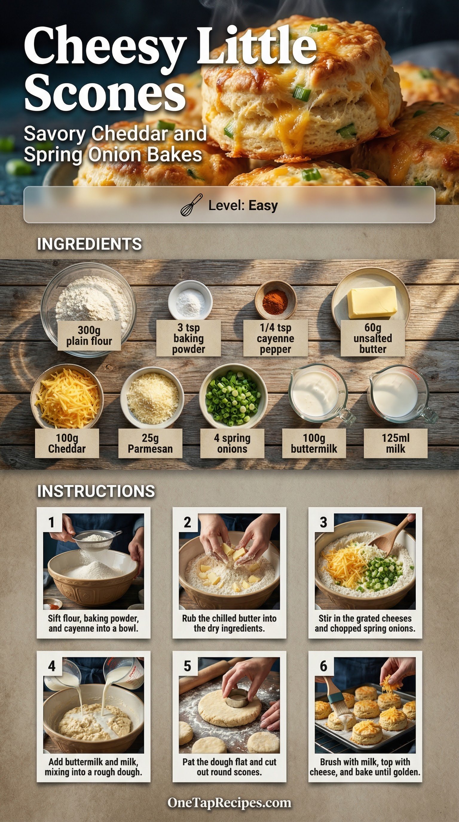 These savory little scones are packed with sharp Cheddar, Parmesan, and fresh spring onions. A splash of buttermilk keeps the crumb tender and moist, while a pinch of cayenne pepper adds a subtle background heat. They come together quickly by hand and bake up tall with a beautiful golden crust. Serve them warm right out of the oven with a pat of butter, or pair them with a steaming bowl of soup for a comforting lunch.