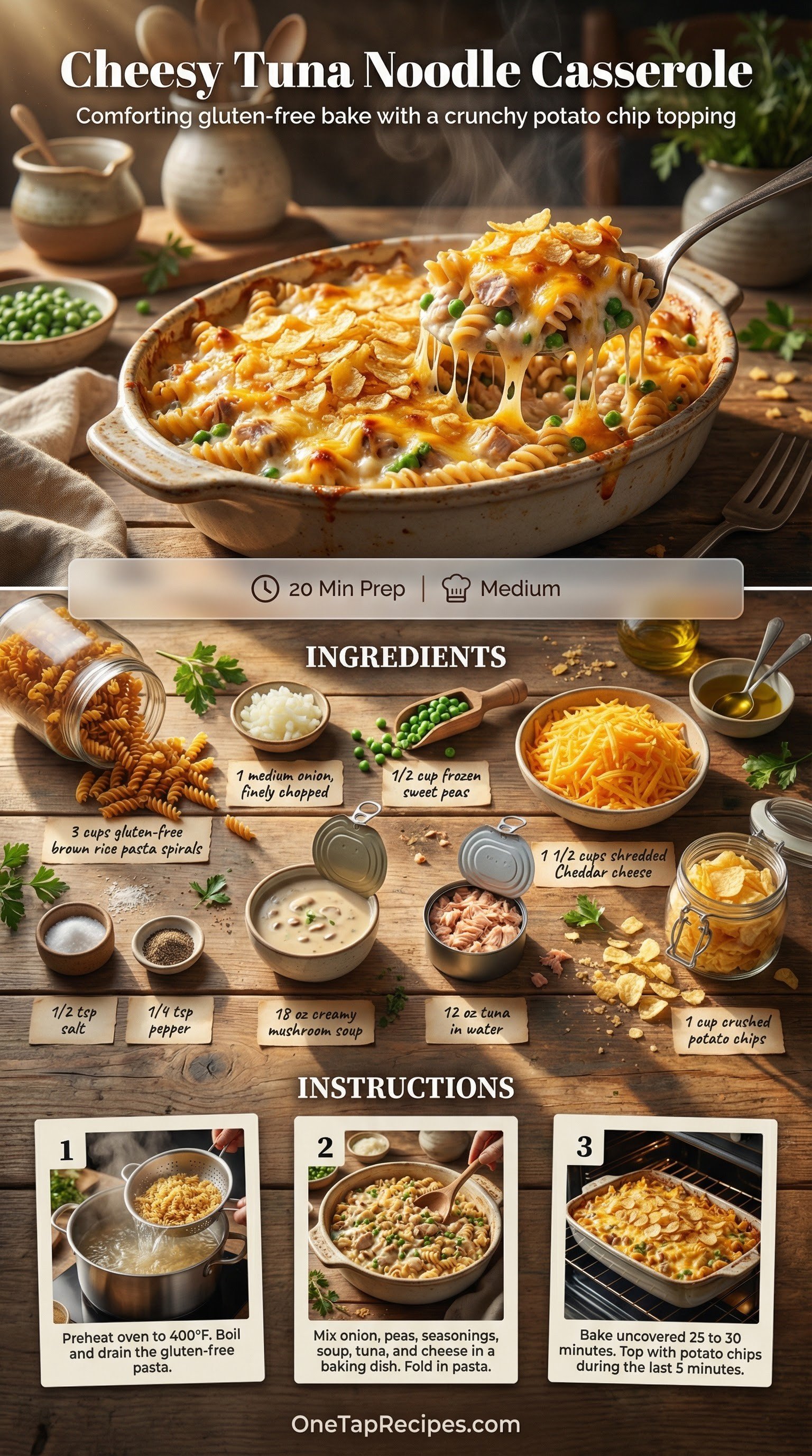 This classic comfort food brings together tender gluten-free pasta, flaky tuna, and sweet peas in a rich mushroom sauce. A generous layer of sharp cheddar cheese melts through the casserole, while crushed potato chips add a satisfying crunch to every bite. It is a perfect weeknight dinner that comes together quickly and bakes until hot and bubbly.