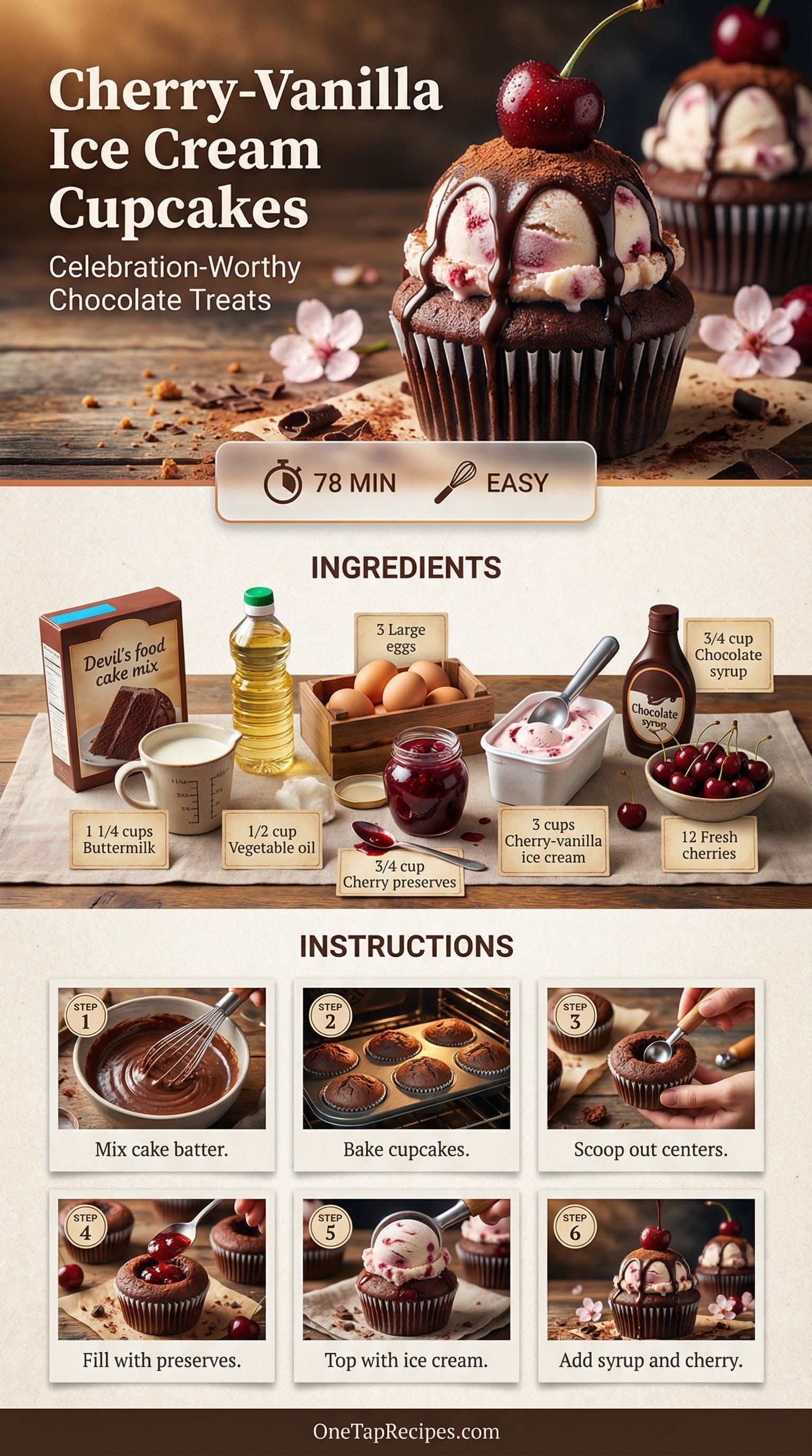 These playful treats turn a standard chocolate cake mix into individual ice cream sundaes. Hollowed-out cupcakes are filled with sweet cherry preserves and topped with a generous scoop of cherry-vanilla ice cream. They are perfect for summer birthdays or casual entertaining. The combination of rich chocolate cake, fruity cherry, and cold ice cream makes every bite delicious.