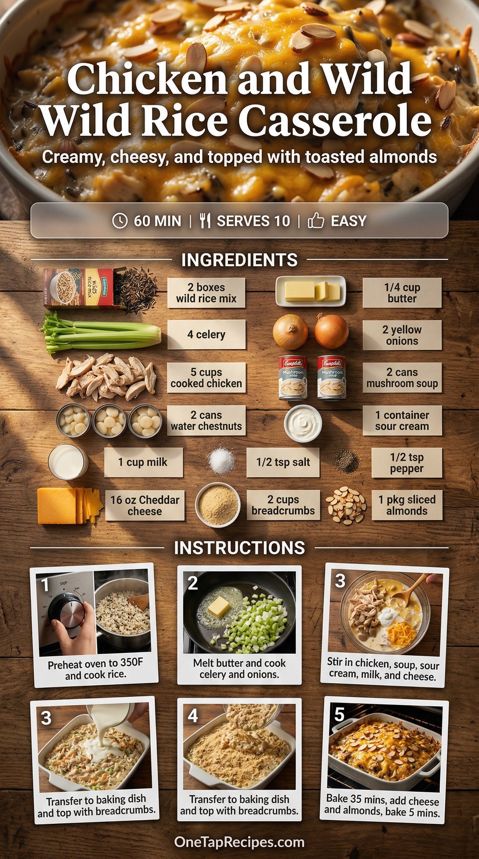 This comforting chicken and wild rice casserole brings together tender chicken, savory mushrooms, and a rich, creamy sauce. The addition of water chestnuts provides a satisfying crunch that contrasts perfectly with the soft rice and melted cheddar cheese. A topping of fresh breadcrumbs and toasted almonds adds a final layer of texture to every bite. It is an ideal choice for a cozy weeknight dinner or a large family gathering. You can easily split the mixture into two smaller baking dishes to freeze one for later.
