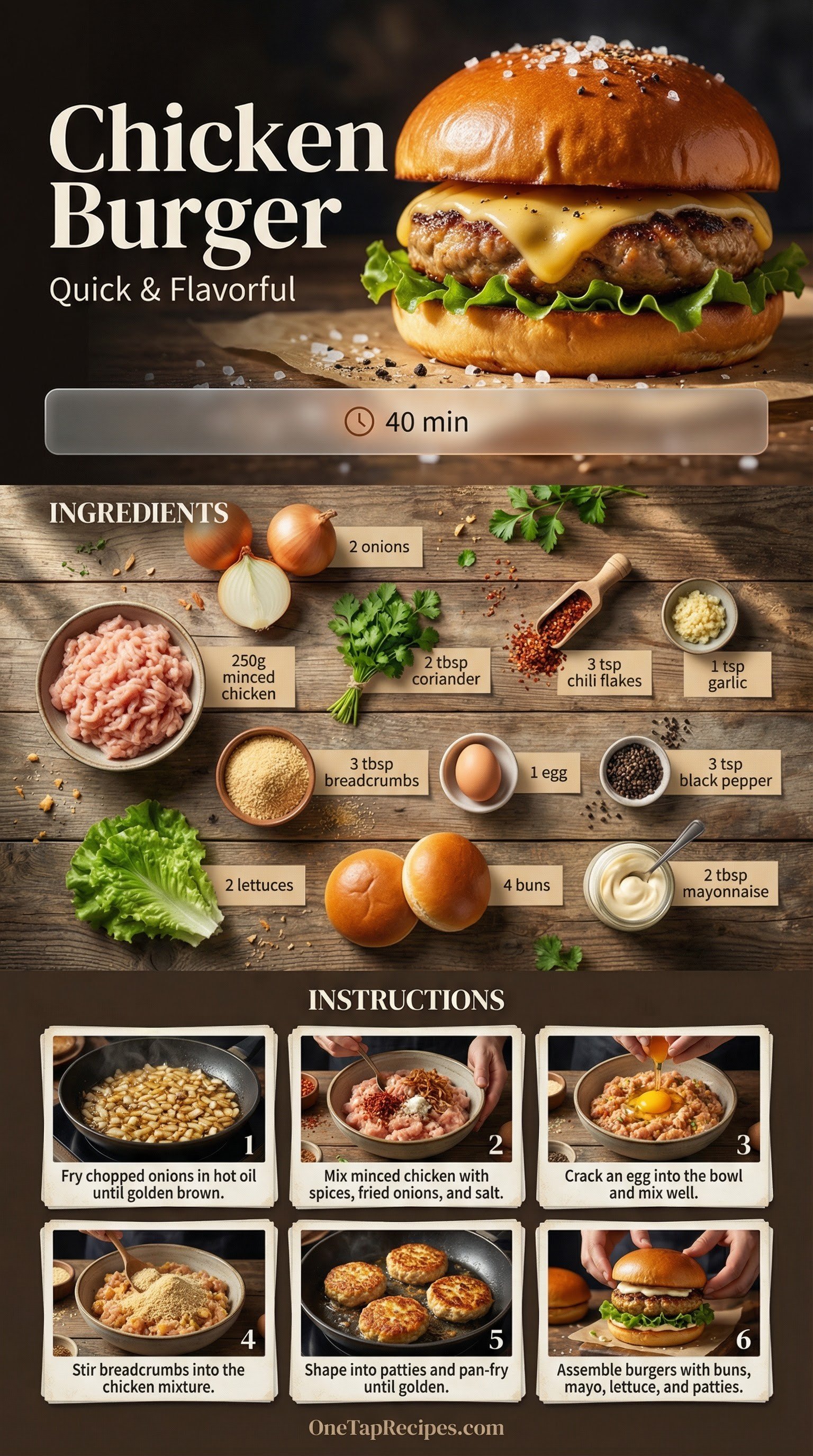 These homemade chicken burgers feature juicy, seasoned patties made from minced chicken. Fresh coriander, garlic, and chili flakes give the meat a bright, savory kick. They are quick to mix together and pan-fry, making them a great choice for a casual weeknight dinner. Serve them on soft buns layered with crisp lettuce and creamy mayonnaise for a satisfying meal.