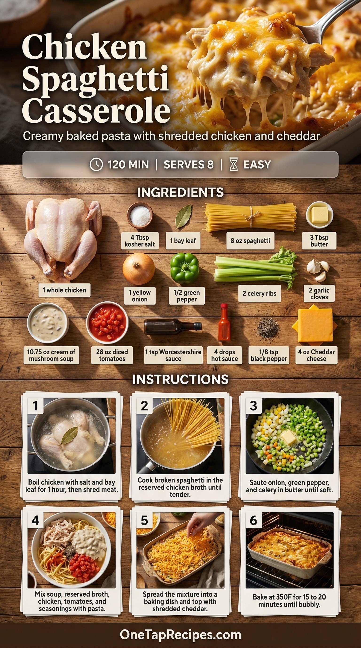 This hearty baked pasta dish combines tender shredded chicken, spaghetti, and a creamy vegetable sauce. The pasta is cooked directly in homemade chicken broth to absorb maximum flavor before baking. Perfect for a comforting family dinner, the casserole features a rich mushroom soup base mixed with diced tomatoes, celery, and bell peppers. A generous layer of melted cheddar cheese finishes it off for a satisfying, savory meal.