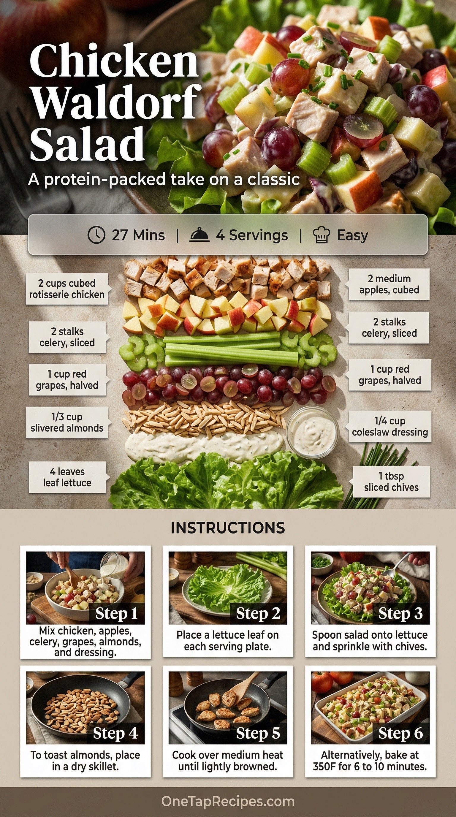 A hearty take on the classic fruit and nut salad, upgraded with tender rotisserie chicken for a satisfying main course. Crisp apples, sweet red grapes, and crunchy celery provide a refreshing contrast to the creamy coleslaw dressing and savory chicken. It comes together in minutes, making it an ideal choice for a quick weekday lunch or a light weekend brunch.