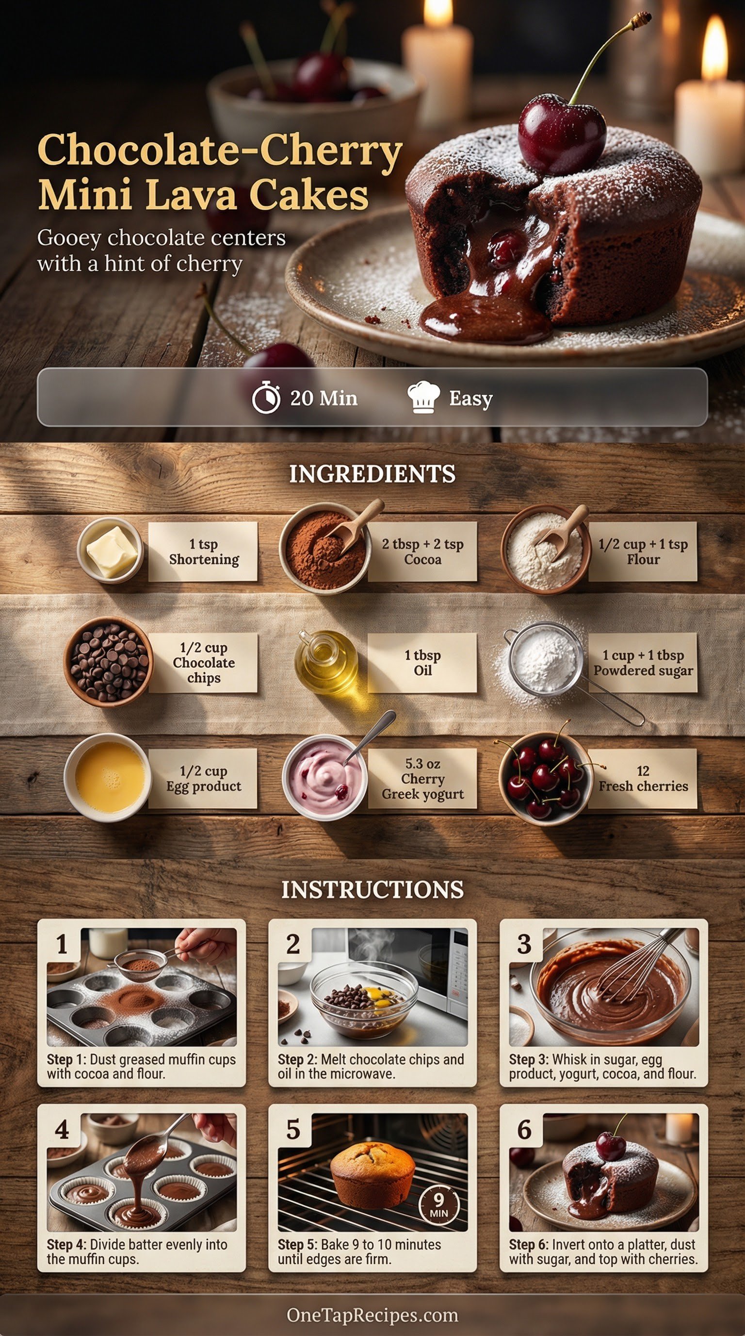 These mini lava cakes deliver rich chocolate flavor with a gooey, molten center. Black cherry Greek yogurt adds moisture and a subtle fruit note to the batter. Baking them in a standard muffin tin makes portioning simple and removes the need for special ramekins. They come together quickly for a weeknight treat or a casual dinner party. Serve them warm right out of the oven to enjoy the soft centers.