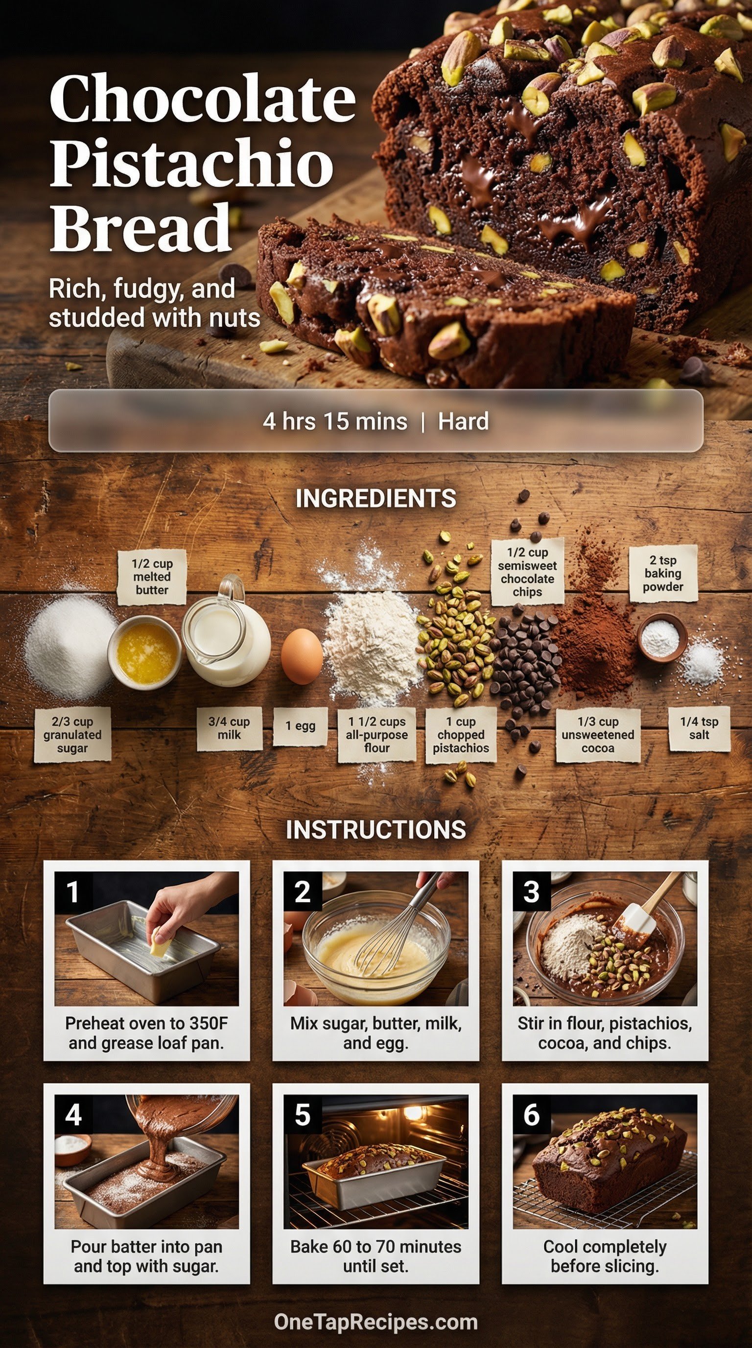 This rich quick bread combines a double dose of chocolate with crunchy chopped pistachios. The batter uses both unsweetened cocoa powder and semisweet chocolate chips to create a deep, fudgy flavor profile. Serve thick slices alongside your morning coffee or enjoy it as a sweet afternoon treat. The tender, cake-like crumb contrasts perfectly with the roasted nuts and a sparkly sugar crust on top.