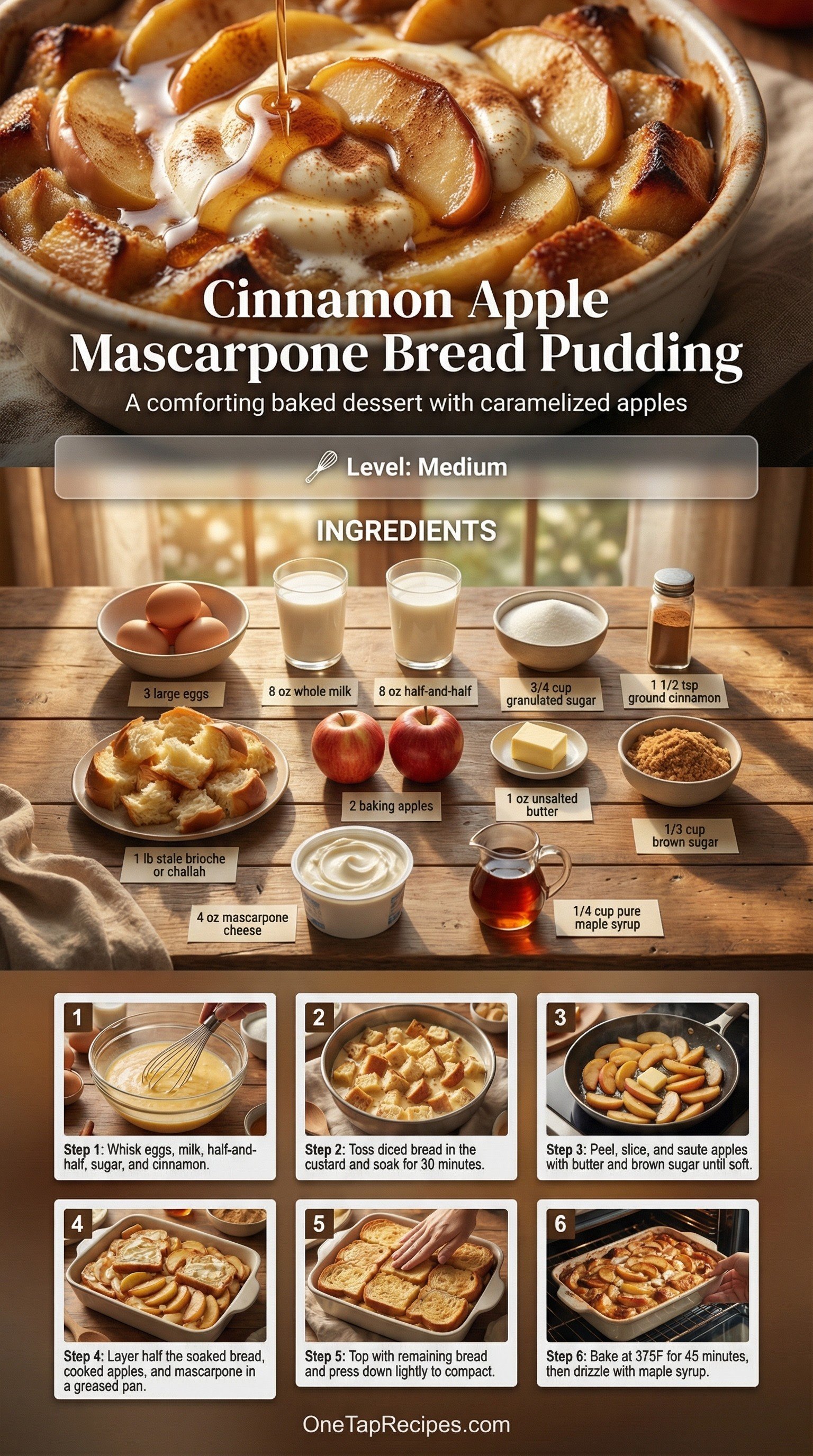 Cinnamon apple mascarpone bread pudding is a comforting baked dessert that pairs tender spiced apples with rich custard. Stale brioche or challah soaks up a sweet mixture of milk, cream, and cinnamon to create a soft, pillowy base. Caramelized apples and creamy pockets of mascarpone cheese are layered inside before baking to a golden brown finish. A final drizzle of pure maple syrup adds a touch of earthy sweetness. Serve this warm casserole for a cozy weekend brunch or a special holiday breakfast.