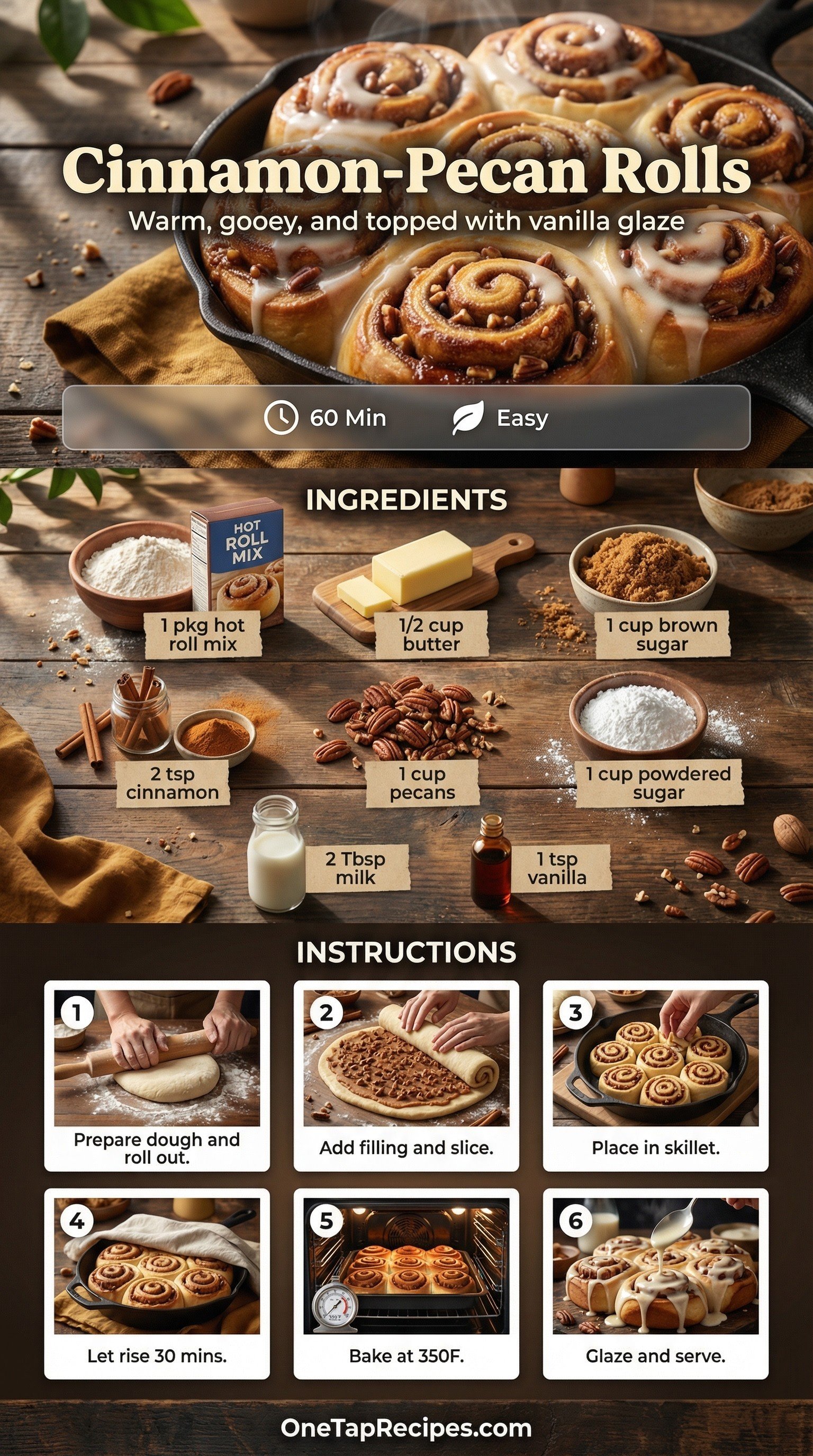 These sweet cinnamon-pecan rolls offer the comforting smell of a weekend bakery right in your own kitchen. Using a hot roll mix provides a smart shortcut that saves hours of rising time without sacrificing that soft, pillowy texture. A rich filling of butter, brown sugar, and toasted pecans creates a gooey, caramelized center in every bite. Finished with a simple vanilla glaze, they are perfect for a relaxed Sunday morning or a special holiday brunch.