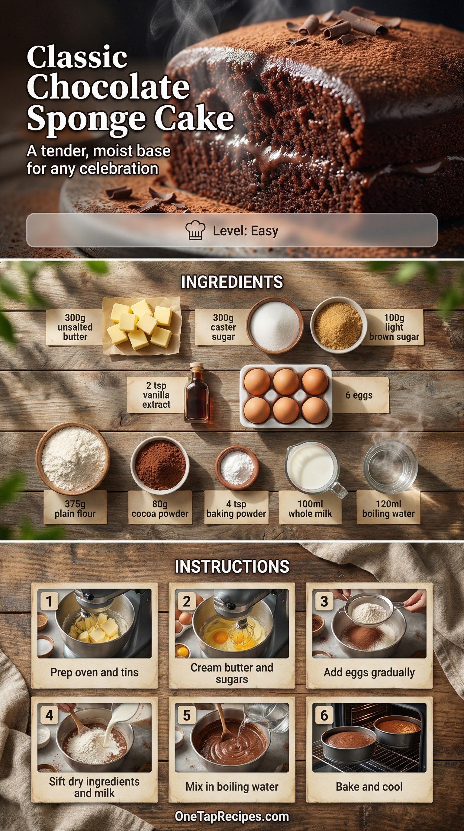 A reliable chocolate sponge cake forms the perfect base for birthday treats and layered desserts. The batter uses a splash of boiling water to create a silky, tender crumb that stays moist for days. It is ideal for celebrations or a simple weekend baking project. Rich cocoa powder and light brown sugar give the sponge a deep, comforting flavor. You can bake it ahead of time and wrap it tightly, or serve it simply with a layer of jam and buttercream.