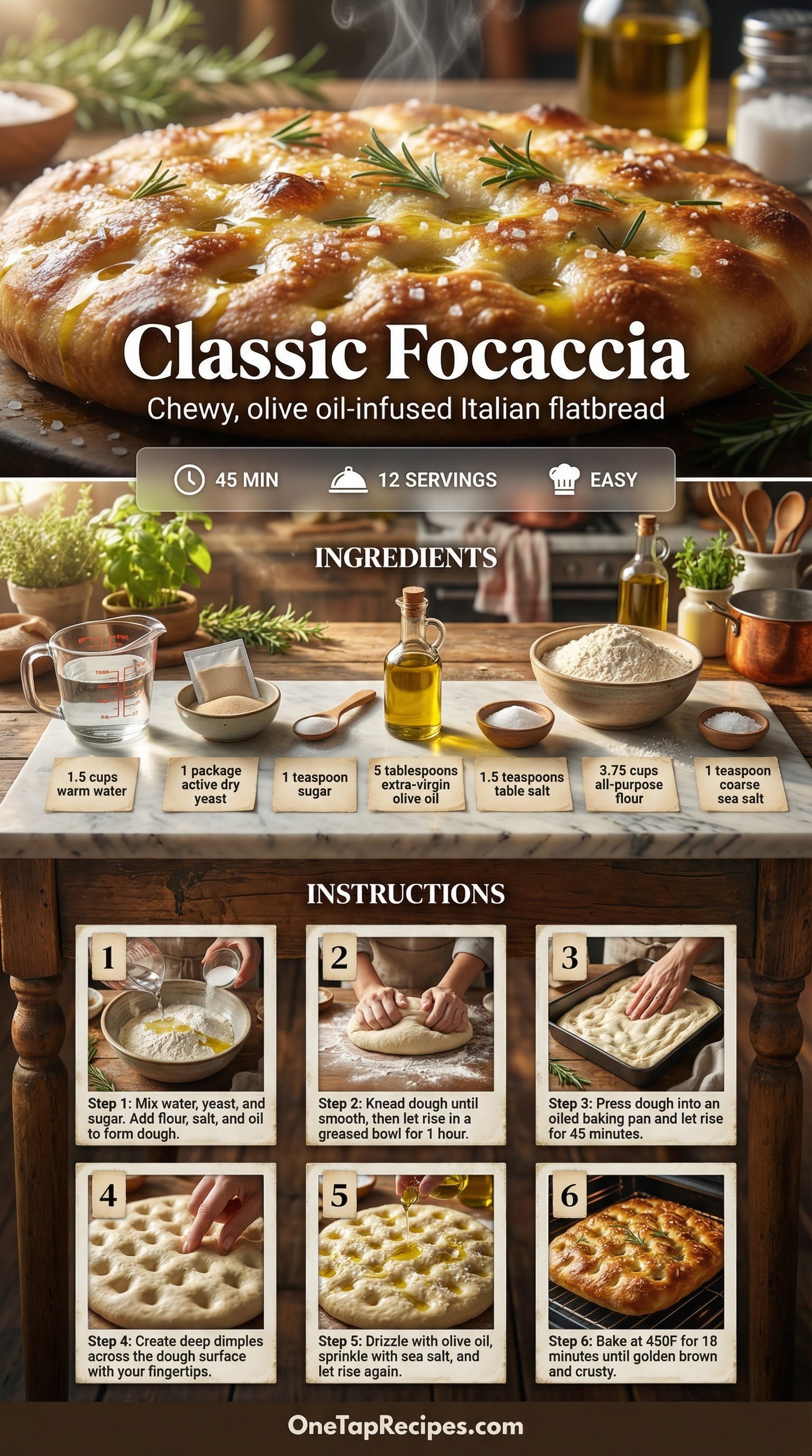 A traditional Italian flatbread, this focaccia delivers a wonderfully chewy texture and a fine crumb. The secret to its airy structure is a patient three-rise process that develops deep flavor. Generous amounts of extra-virgin olive oil create a crisp, golden crust while keeping the interior soft and tender. Coarse sea salt sprinkled on top adds a satisfying crunch to every bite. Serve it warm alongside a hearty soup, use it for sandwiches, or enjoy it simply dipped in balsamic vinegar.