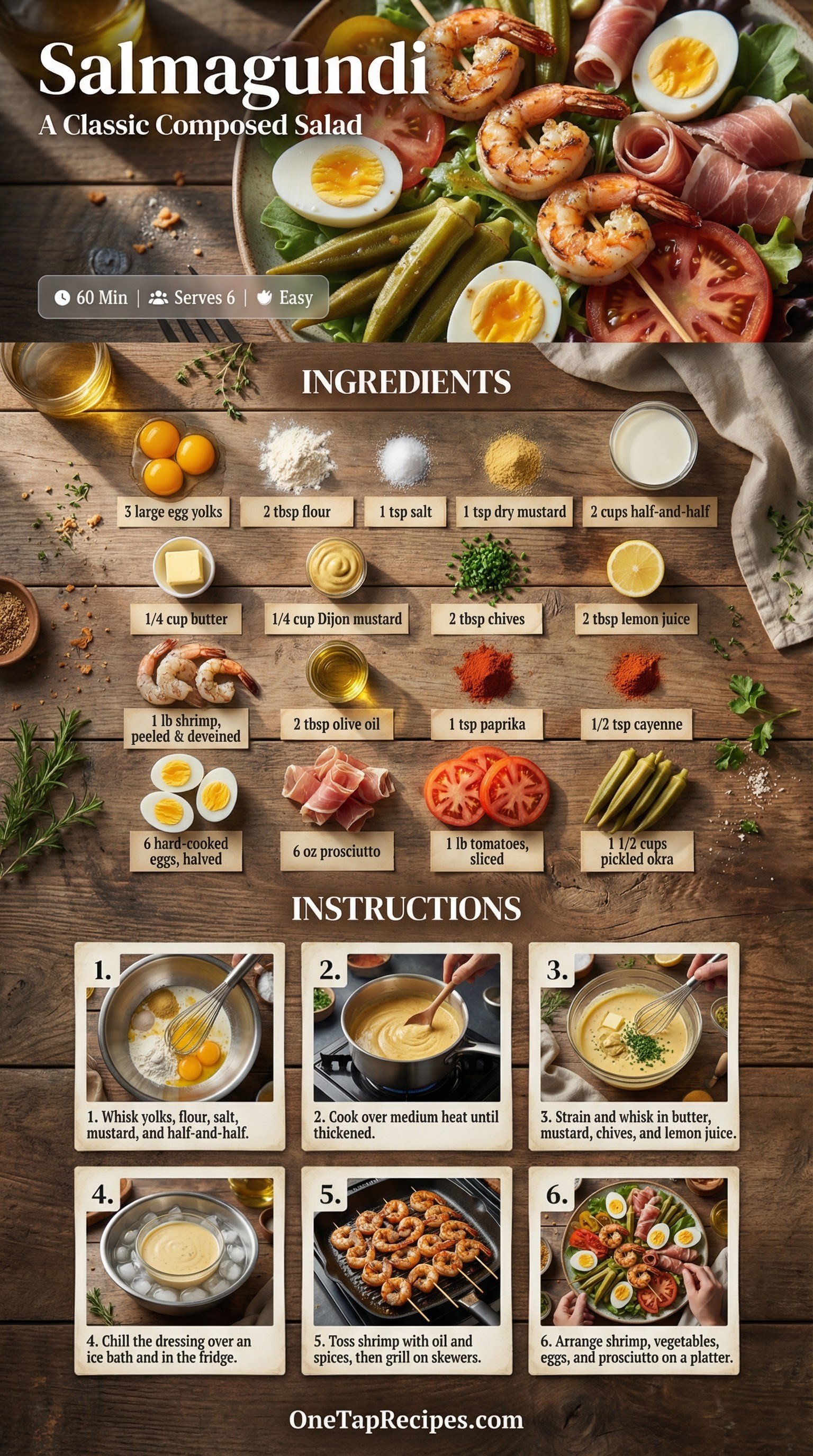 Salmagundi is a classic composed salad that predates the modern Cobb. This hearty platter combines grilled shrimp, hard-boiled eggs, prosciutto, and fresh vegetables for a satisfying meal. A rich, cooked mustard dressing brings all the elements together with a bright, tangy finish. It makes an excellent centerpiece for a weekend lunch or a relaxed dinner party. Serve it family-style so guests can build their perfect plate.