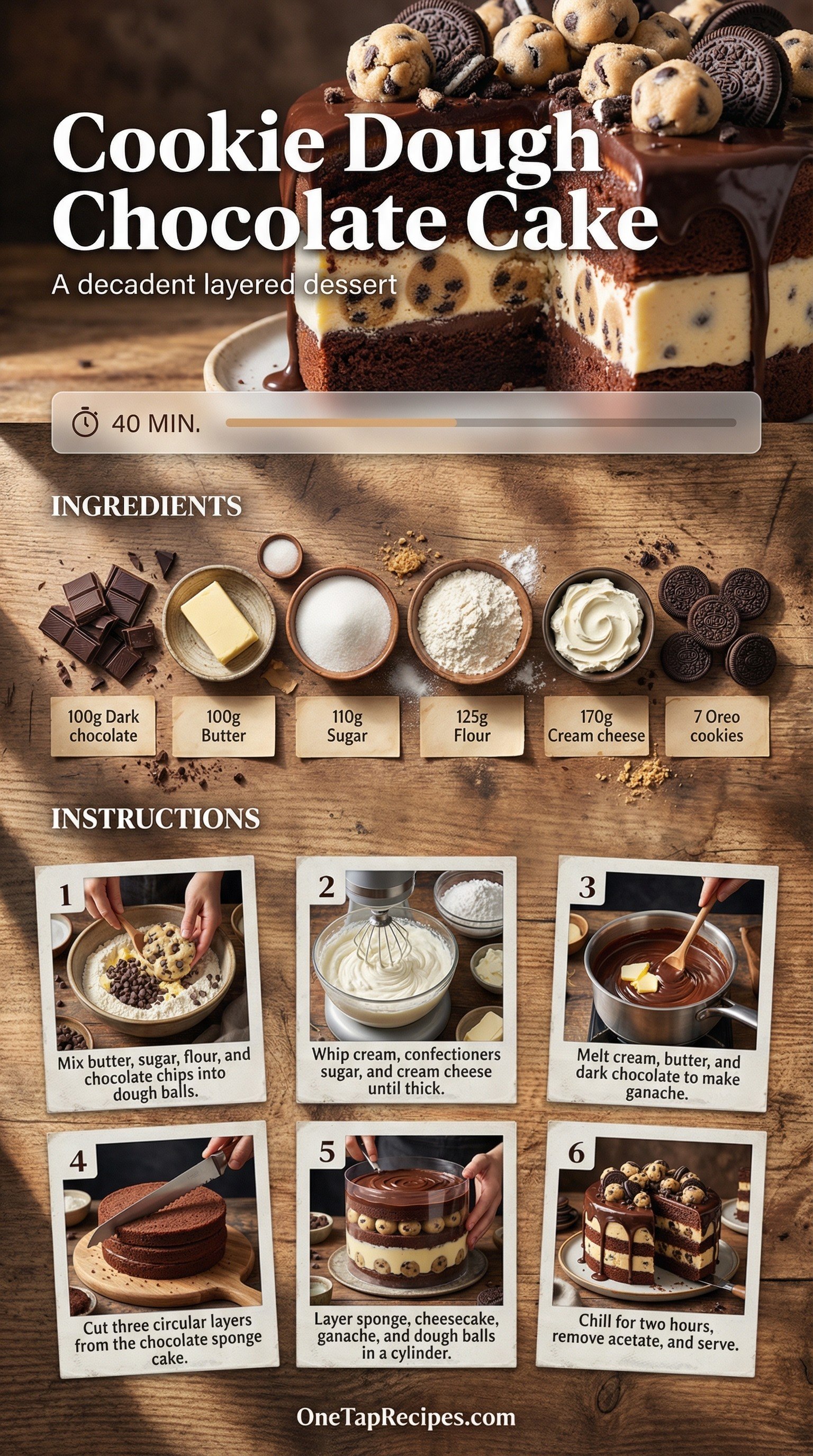 This decadent layered dessert combines chocolate sponge cake, creamy cheesecake, rich chocolate ganache, and edible cookie dough balls. It features multiple textures and flavors stacked high inside an acetate cylinder for a bakery-style presentation. Serve this impressive treat for birthdays or special celebrations when you want a show-stopping centerpiece. The combination of soft cake, crunchy chocolate sandwich cookies, and chewy cookie dough creates an irresistible bite.