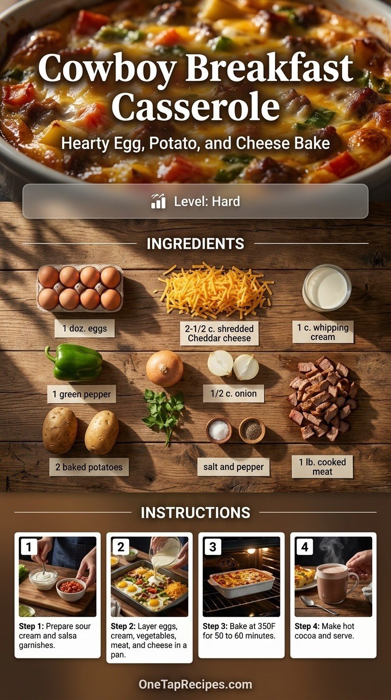 This hearty breakfast casserole is a baked egg dish loaded with tender potatoes, sharp cheddar cheese, and your choice of savory breakfast meat. It layers rich whipping cream, crisp green peppers, and onions directly into the pan without any stirring required. The hands-off baking method creates a beautifully set, comforting meal that easily feeds a hungry crowd. Serve this warm, savory bake on a weekend morning or for a holiday brunch, topped with fresh salsa and sour cream.