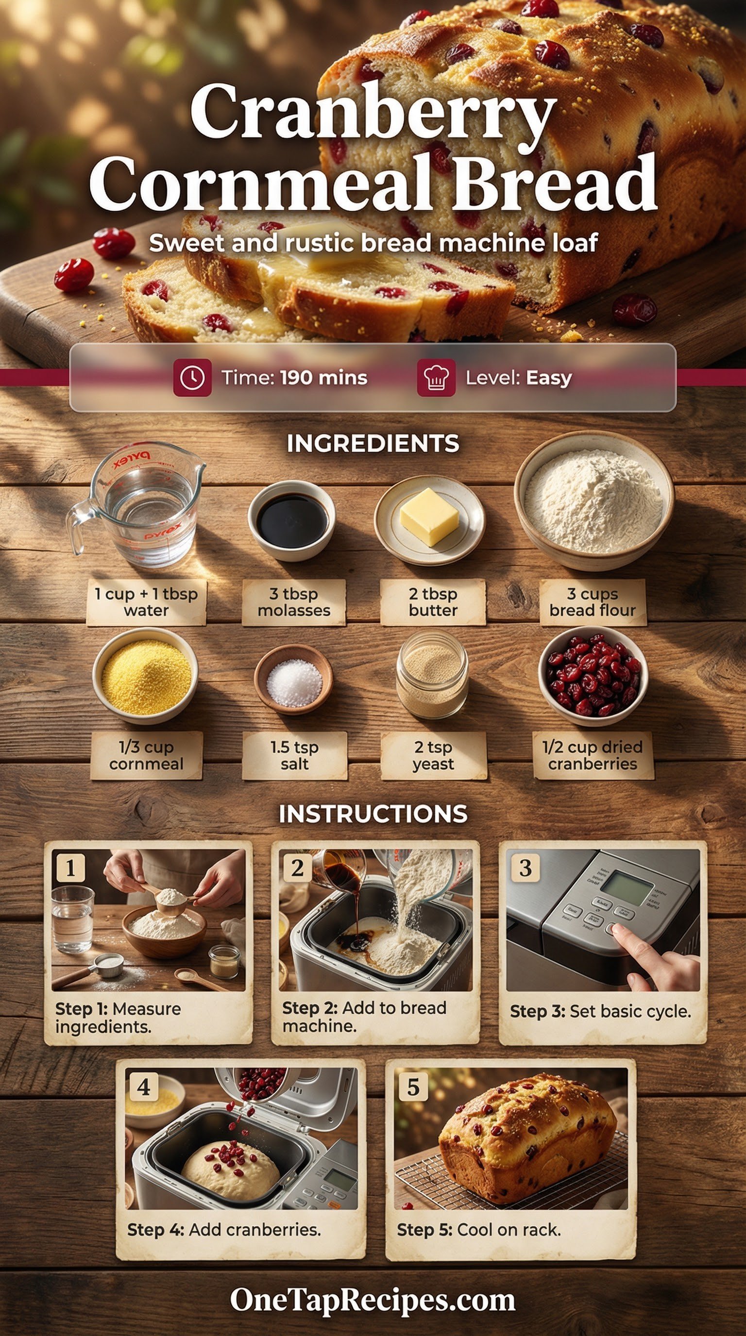 This rustic bread machine loaf combines hearty cornmeal with sweet dried cranberries. Molasses and butter add a rich depth of flavor to the dough, while the bread machine handles all the heavy lifting. It makes a wonderful breakfast slice toasted with butter or a sturdy base for leftover turkey sandwiches. The cornmeal provides a pleasant crunch that contrasts perfectly with the chewy, tart berries.